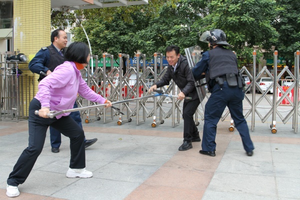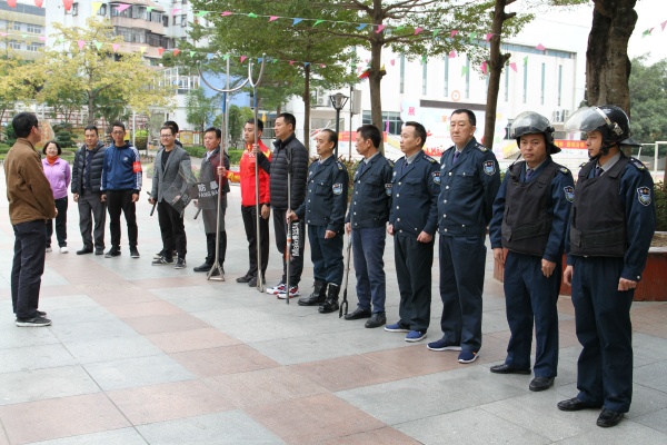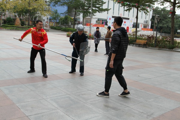 主管學(xué)校安保工作的吳潔監(jiān)主任在演練前強調(diào):“如果在校園內(nèi)遇到歹徒襲擊,安保人員要馬上集合將其制服,值日老師負(fù)責(zé)疏散學(xué)生和報警?!痹诎脖j犻L的主持下,安保培訓(xùn)和演練活動正式開始。學(xué)校安全保衛(wèi)隊員先學(xué)習(xí)相關(guān)安保業(yè)務(wù)知識,并現(xiàn)場展示講解鋼叉、辣椒噴霧、盾牌、警棍、防割手套等常用防暴器材的功能和使用方法,隨后進(jìn)行了反恐防暴應(yīng)急演練。校門口一名“歹徒”手持木棍,想強行闖入校園行兇,安保人員發(fā)現(xiàn)后,在第一時間拉起警報并開啟一鍵報警,另一名保安人員手持盾牌及警棍立即上前阻攔,隨后其他安保人員及時跟進(jìn)配合,利用警棍、鋼叉等將歹徒制服,整個培訓(xùn)演練圓滿完成。林華志校長最后進(jìn)行了總結(jié)發(fā)言指出:“校園安全工作重如泰山,安保人員要認(rèn)真履行崗位職責(zé),定時開展校園巡查,嚴(yán)格執(zhí)行校園管理規(guī)定,要切實做好保護(hù)學(xué)生校園安全的工作,加強全體安保人員的防暴安全演練。”