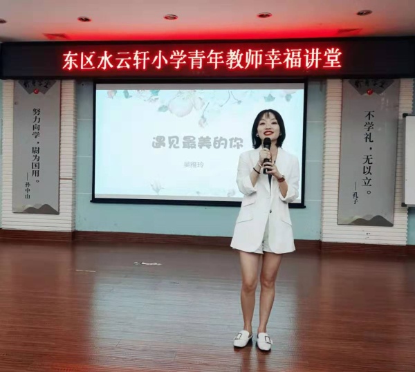 為了給青年教師一個(gè)展示自我、分享經(jīng)驗(yàn)的機(jī)會(huì),東區(qū)水云軒小學(xué)于2019學(xué)年,面向全體教師開展系列青年教師幸福講堂活動(dòng),讓青年教師通過幸福講堂這個(gè)平臺(tái),充分鍛煉自己的演講表達(dá)能力和膽量,在分享先進(jìn)思想、獨(dú)特見解的同時(shí),達(dá)到共同進(jìn)步,提高綜合素質(zhì)的目的。