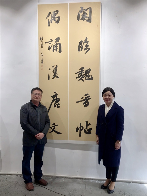 此次展以“傳承”為主題,再貼切不過(guò),德藝雙馨的駱培華先生與其弟駱建華先生幼承庭訓(xùn),臨池不輟,各有所成,并對(duì)其兒女接續(xù)薪傳;駱氏兄弟二十年來(lái)為推動(dòng)當(dāng)?shù)貢ㄋ囆g(shù)的教育傳承與發(fā)展不遺余力,雍景園小學(xué)亦是受惠單位之一,今年上半年雍景園小學(xué)有幸聘請(qǐng)駱培華擔(dān)任學(xué)校的“中華優(yōu)秀傳統(tǒng)文化”教育顧問(wèn),為雍景園小學(xué)“中華優(yōu)秀傳統(tǒng)文化”學(xué)習(xí)的發(fā)展指引方向。再者是駱培華先生對(duì)書法藝術(shù)的執(zhí)著追求,為我輩做出了榜樣。駱培華先生的書法,從唐楷入手,后博涉諸家,受宋代文人的尚意書風(fēng)影響,尤其著迷于東坡居士。其書法作品棄時(shí)風(fēng)而得古蘊(yùn),內(nèi)在精神、氣質(zhì)、神完氣足,正所謂書如其人。駱培華先生除書法創(chuàng)作水平高之外,在文學(xué)詩(shī)詞歌賦上均有深厚功底,“閑臨魏晉帖,偶誦漢唐文”,這是駱培華先生此展中的其中一幅自撰自書的行書對(duì)聯(lián)作品。作品氣勢(shì)磅礴遒勁有力的筆觸,如磐石一樣厚重的字體,有著強(qiáng)烈的書寫藝術(shù)感染力,這或許正是駱培華先生日常學(xué)習(xí)的自謙,豐富的人生歷練,高尚的人格涵養(yǎng),厚實(shí)的文化底蘊(yùn),又豈能是“閑臨與偶誦”中能得。