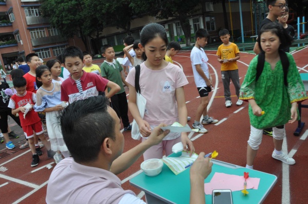 游園活動(dòng)分成二十五個(gè)游戲攤位,攤位游戲包含了美術(shù)、心理、體育、科學(xué)4個(gè)板塊,融合了多個(gè)科目的精彩!其中,美術(shù)類攤位運(yùn)用繪畫、印版、折紙、軟陶、書法等技藝,讓同學(xué)們能發(fā)揮所長(zhǎng),創(chuàng)作屬于自己的“兒童節(jié)禮物”,十分有趣。心理類攤位從珍愛(ài)生命,呵護(hù)心靈角度出發(fā),面向全校同學(xué)安排了“同舟共濟(jì)”、“護(hù)蛋行動(dòng)”、“生命歷程”、“我是小家長(zhǎng)”等游戲。其中“護(hù)蛋行動(dòng)”就是在活動(dòng)開(kāi)始前,每位同學(xué)都領(lǐng)到一枚鵪鶉蛋,同學(xué)們扮演“父母”一職,用自己的辦法把蛋保護(hù)好,一天下來(lái),大部分同學(xué)能把這小小的鵪鶉蛋保護(hù)好。體驗(yàn)活動(dòng)讓學(xué)生學(xué)會(huì)宣泄情緒,體會(huì)生命的可貴??茖W(xué)類攤位雖然只有4個(gè)攤位,可游戲里藏有大大的科學(xué)原理,如“投擲磁鐵飛鏢”、“一口氣吹氣球”等,同學(xué)們?cè)谕嬗螒虻倪^(guò)程中還能親身體驗(yàn)書本中學(xué)到的科學(xué)原理。體育類攤位更是發(fā)揮學(xué)科優(yōu)勢(shì),用籃球和足球設(shè)計(jì)了多個(gè)攤位游戲,同學(xué)們既學(xué)習(xí)了運(yùn)球技術(shù)也鍛煉了身體。
