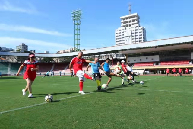 跑步活動結(jié)束后,廣東省教育廳工會、廣州美術(shù)學院工會、廣東援疆工作隊、駐粵部隊共4支足球隊開展了軍地足球交流活動,共有近百名足球愛好者參加了交流,一起健康運動為祖國慶生。
