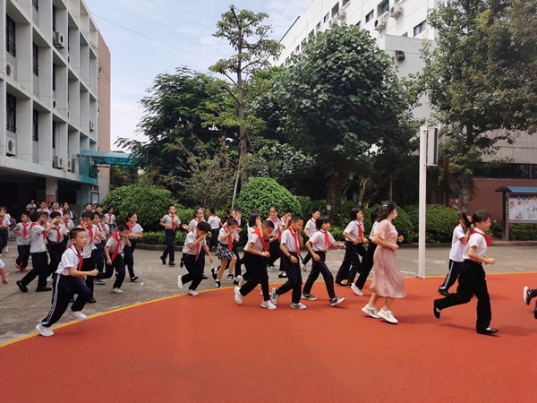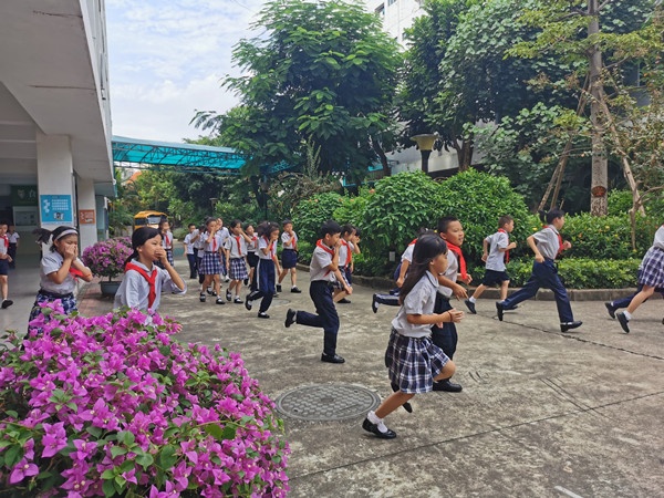 當(dāng)天下午1:40教學(xué)區(qū)、宿舍區(qū)各樓層鳴響警報(bào),全體進(jìn)入應(yīng)急狀態(tài)。同學(xué)們?cè)诶蠋煹闹敢?,立即彎腰、用手捂住口鼻,緊張有序地沿著逃生路線,迅速地向操場(chǎng)疏散撤離。從警報(bào)聲響起到最后一個(gè)同學(xué)來到球場(chǎng),共用時(shí)2分50秒,全體師生認(rèn)真參與。