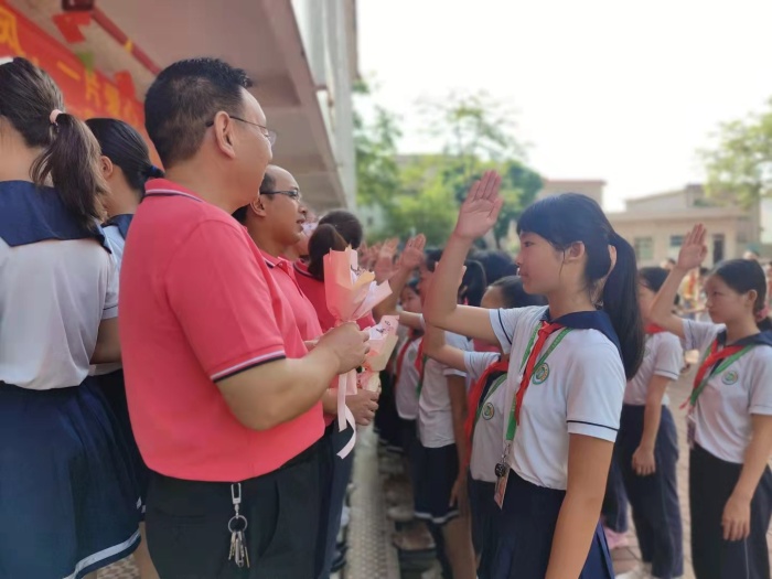 大會第三項,少先隊員代表向每一位老師獻上鮮花,并送上了節(jié)日的祝福。最后,劉品江校長與學(xué)校的優(yōu)秀教師、骨干教師合影留念。