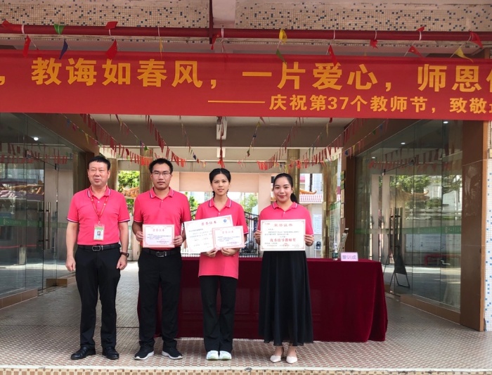 大會第二項,政教處陳七靈副主任宣讀了表彰的中山市優(yōu)秀教師及中山市優(yōu)秀少先隊輔導(dǎo)員,劉品江校長與何元柱副校長為他們頒發(fā)了榮譽證書。