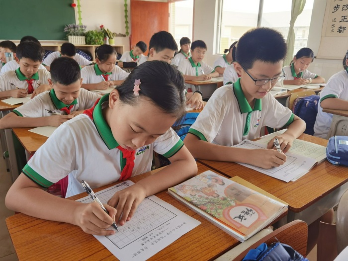 各年級也舉辦了特色鮮明的推廣普通話活動。一年級的小同學化身小老師,用標準的普通話向長輩們誦讀課文或講述生動有趣的故事,讓推普活動走進家家戶戶。二年級的紅領(lǐng)巾宣講員們同學們字正腔圓、聲情并茂地講述了英雄先烈們的英勇感人事跡,傳承紅色基因。三年級的同學們?yōu)橥破栈顒釉O(shè)計了一幅幅版式精美的推廣普通話宣傳標語。四年級老師和同學們精心挑選誦讀內(nèi)容進行誦讀經(jīng)典詩文比賽。千年流傳的文化古韻,伴著稚嫩的聲音,為校園增添了濃厚的文化韻味。五年級開展了繪制“講普通話,寫規(guī)范字”手抄報比賽活動。同學們通過精美的手抄報,用實際行動響應祖國“推普”號召,抒發(fā)自己的愛國情!漢字硬筆書法比賽在六年級中開展。同學們筆尖流轉(zhuǎn)出一行行優(yōu)美的漢字,在字里行間發(fā)現(xiàn)中華文字的魅力,發(fā)現(xiàn)中華文化的深厚內(nèi)涵。