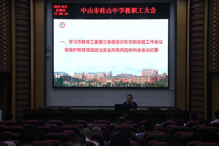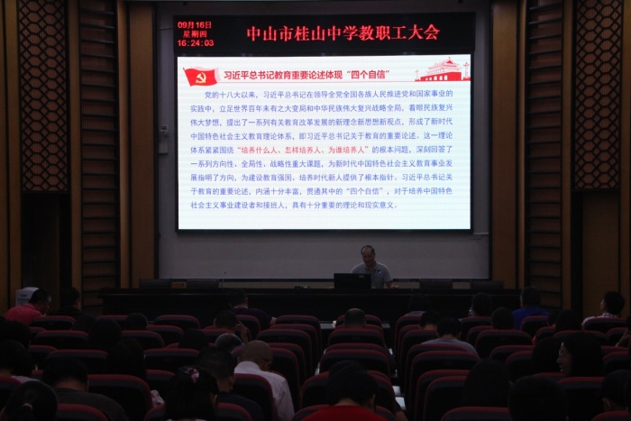 為持續(xù)深入學(xué)習(xí)領(lǐng)會習(xí)近平總書記“七一”重要講話精神,9月16日下午,桂山中學(xué)在德馨樓一樓報告廳開展主題黨課學(xué)習(xí)。主題黨課的主要學(xué)習(xí)內(nèi)容是習(xí)近平總書記“四個自信”和“七一”重要講話精神中蘊含的“中國之治”與“中國之智”。主題黨課由學(xué)校黨委委員劉云平同志主持。