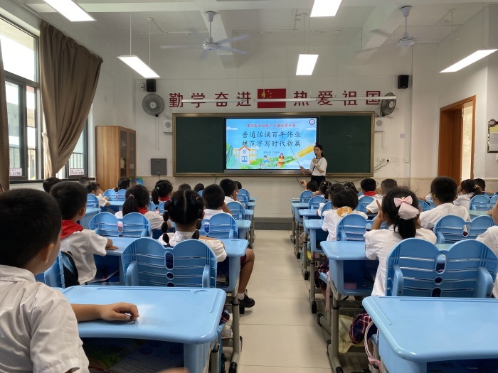 在德育處的組織下,各班精心開(kāi)展了以“普通話誦百年偉業(yè),規(guī)范字寫(xiě)時(shí)代新篇”為主題的班隊(duì)會(huì)活動(dòng),積極宣傳《中華人民共和國(guó)國(guó)家通用語(yǔ)言文字法》以及相應(yīng)的普通話基礎(chǔ)知識(shí)。