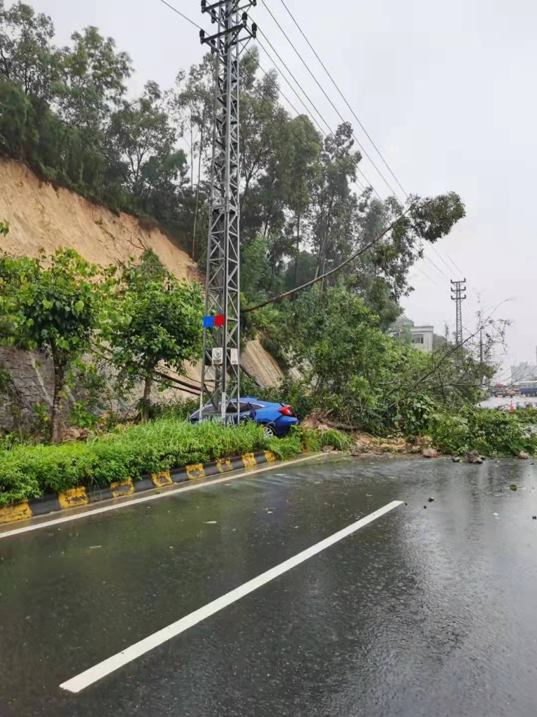 滑坡具體位置為國道G228線K6053+720處(神灣東華村珠海往中山方向路段),滑坡面積約300平方米,現(xiàn)場有一輛小汽車受損,沒有人員傷亡,該路段珠海往中山方向交通中斷,車輛通行利用中山往珠海方向進行雙向通車。