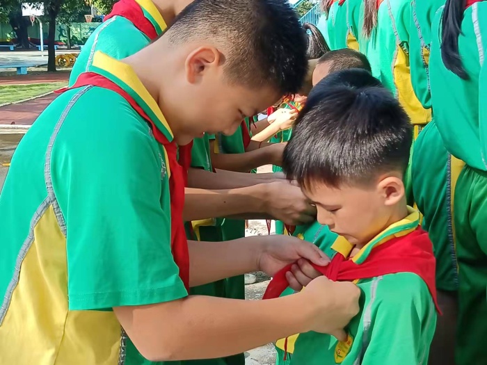 接著,吳曉燕老師宣讀第一批少先隊(duì)員名單并對(duì)新進(jìn)的少先隊(duì)員表示祝賀,六年級(jí)的少先隊(duì)隊(duì)干為新隊(duì)員佩戴了紅領(lǐng)巾。鮮艷的紅領(lǐng)巾飄揚(yáng)在前胸,新隊(duì)員面向隊(duì)旗莊嚴(yán)宣誓,一張張小臉上寫滿了光榮與自豪,小小的拳頭充滿力量。