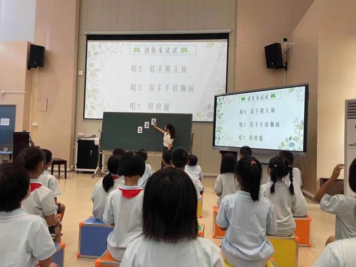 活動(dòng)伊始,由陳靖甜老師帶來二年級(jí)上冊(cè)第2課《乃喲乃》。陳老師重點(diǎn)教授do mi sol的音準(zhǔn)。她通過節(jié)奏練習(xí)、身勢(shì)活動(dòng)讓學(xué)生熟悉do mi sol的音高音準(zhǔn),隨后用“師問生答”的方式引導(dǎo)學(xué)生運(yùn)用do mi sol進(jìn)行旋律創(chuàng)編,鞏固了學(xué)生對(duì)do mi soli三個(gè)音的掌握,各個(gè)環(huán)節(jié)環(huán)環(huán)相扣,層層深入,為大家?guī)砹艘还?jié)身勢(shì)與創(chuàng)編相結(jié)合的精彩課堂。