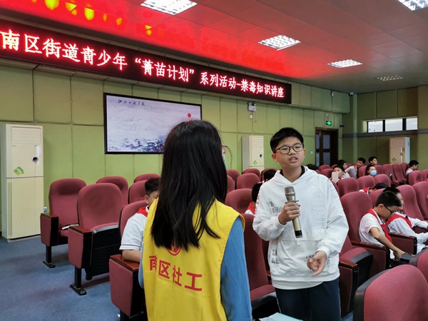 講座上,社工老師通過文字、圖片、視頻等多種形式,更多宣傳各種具有欺騙性的新型毒品,并介紹毒品的傳播套路以及對個(gè)人、家庭、社會(huì)的危害,并介紹了拒絕毒品的方式,引導(dǎo)學(xué)生在危險(xiǎn)處境中學(xué)會(huì)保護(hù)自己。最后,禁毒社工還向同學(xué)們發(fā)出倡議,防范毒品侵害,樹立安全意識(shí)。