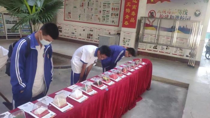 隨后,林警官通過一系列圖片,向同學(xué)們展示了常見的毒品及其辨識(shí)方法。其中,傳統(tǒng)毒品包括鴉片、海洛因、罌粟殼、大麻、病毒、搖頭丸和麻古、阿拉伯茶、干花和紅冰;還有一些常見的新型毒品包括奶茶、浴鹽、開心水、止咳水、跳跳糖、神仙水和郵票毒品。林警官通過對(duì)這些毒品的成分、外觀和吸食后果進(jìn)行介紹,讓同學(xué)們直觀地學(xué)會(huì)辨識(shí)毒品、更深刻地認(rèn)識(shí)到毒品的危害性、成癮性和非法性。