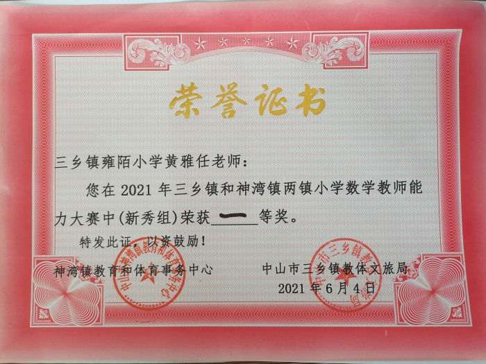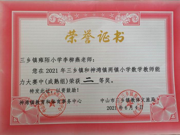 10月14日早上,在神灣中心小學(xué)舉行了兩鎮(zhèn)小學(xué)數(shù)學(xué)教師素養(yǎng)大賽成熟組的決賽。李柳燕老師精心設(shè)計(jì)導(dǎo)入,善于發(fā)現(xiàn)并利用生活中的數(shù)學(xué)知識(shí),層層遞進(jìn),聲情并茂,還融合了學(xué)科知識(shí)。最后以第三名的成績(jī)榮獲總決賽二等獎(jiǎng)。