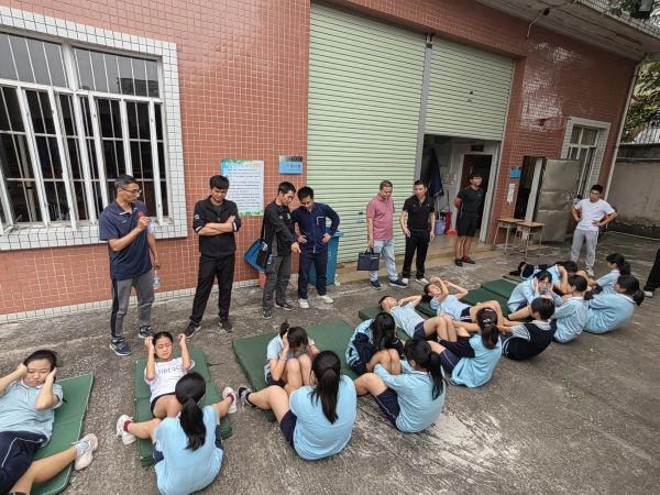檢查組一行還察看了抽測場地,檢查了物資準備情況。當來到體育場,正好碰上初一級體育課,學生正在訓練仰臥起坐,檢查組現(xiàn)場指導了學生動作要領(lǐng),指出容易犯錯的地方。