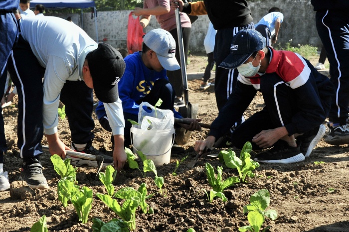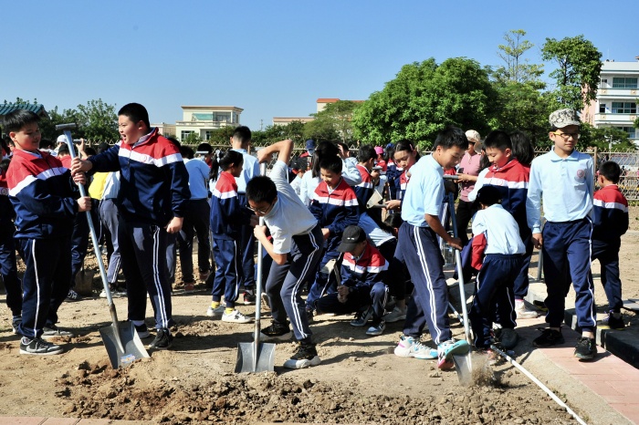 同學們有種植花卉的經(jīng)驗,可面對扎實堅硬的荒地,還是頭一次掄起翻土的鐵鍬呢。在家長和老師的示范下,同學們輪流學用沉重的鐵鍬翻地,大塊的泥頭被掘起,菜地里揚起一陣灰塵。同學們深知耕種不易,是實實在在的技術(shù)活和體力活。翻土之后就是整地,同學們用小的鋤頭把大塊的泥頭敲碎,在有種菜經(jīng)驗的家長的指導下起壟做畦,種下菜苗,澆水固根。