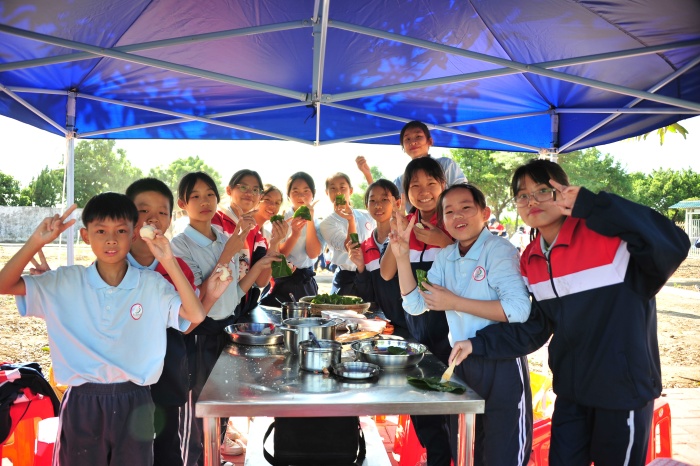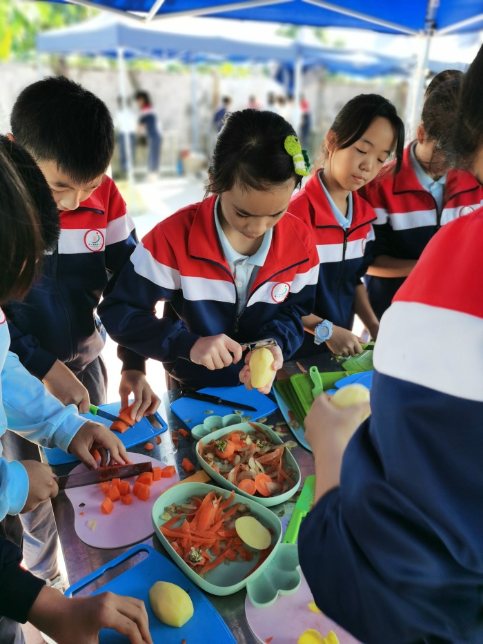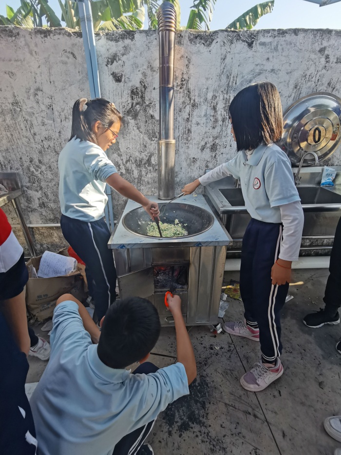 另一邊的同學正在用親手洗凈的蔬菜瓜果,為大家準備可口的晚餐。備柴生火、煮飯、切菜、炒菜,同學們輪流上崗,井然有序。經(jīng)歷煙熏刺眼,爐火熄滅再燃等種種困難,同學們親手制作的飯菜,仿佛就是美味佳肴。