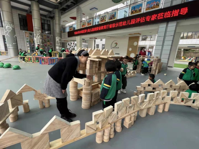 11月1日至3日,水城區(qū)第七幼兒園迎來了省級園的評估驗(yàn)收。三名老師分別負(fù)責(zé)三個(gè)攻堅(jiān)重點(diǎn)區(qū)域活動的組織。開發(fā)區(qū)小隱幼兒園林麗霞副園長負(fù)責(zé)該園大二班的主題建構(gòu)游戲《萬里長城》,她通過前期與班級老師一起引導(dǎo)孩子們深入了解長城的結(jié)構(gòu)、來歷和用途等,豐富幼兒對長城搭建的認(rèn)知經(jīng)驗(yàn),為幼兒提供豐富的材料,從而支撐幼兒搭建水平的進(jìn)一步提高。當(dāng)天,孩子們非常專注、積極互動,一座蜿蜒曲折、創(chuàng)意十足的長城在他們的努力下搭建成功了。