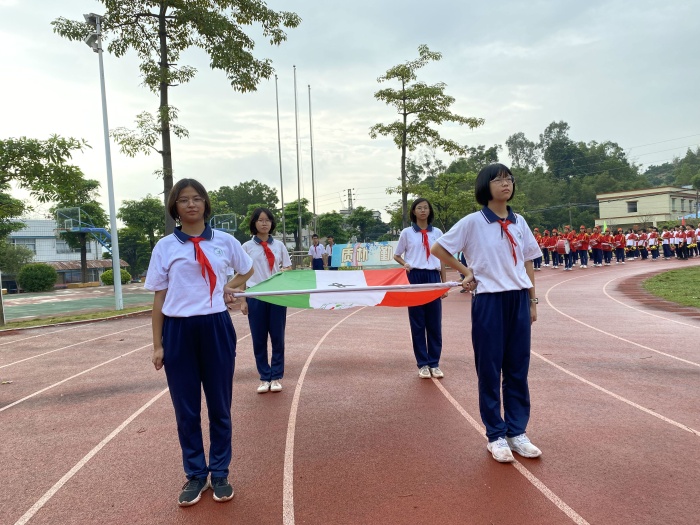 8點整,伴著鼓樂隊激昂的音樂,國旗隊、校旗隊踏著整齊有勁的步伐向我們走來。4名男生高擎國旗,邁著堅實有力的步伐,鮮艷的五星紅旗向全校師生傳達濃濃的愛國情懷。4名女生緊隨其后,步伐輕快,護著校旗,走向主席臺,校旗是坦洲三中大象征,更是“質(zhì)樸、勤勉、敏行”校訓的體現(xiàn),它將激發(fā)運動健兒的斗志,去創(chuàng)造本屆運動會的精彩。