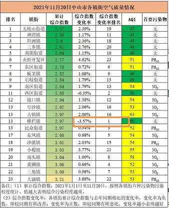 日前,中山市生態(tài)環(huán)境局公布了全市各鎮(zhèn)街空氣質(zhì)量最新情況。記者發(fā)現(xiàn),截至11月20日,中山橫欄鎮(zhèn)空氣質(zhì)量綜合指數(shù)變化率排名全市第一,是今年中山首個空氣質(zhì)量實(shí)現(xiàn)正改善的鎮(zhèn)街。