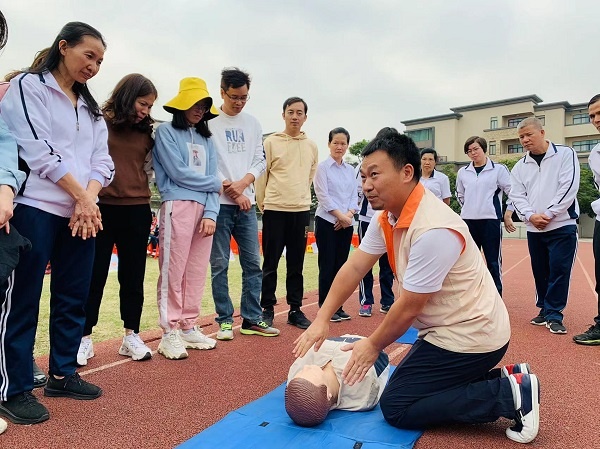 接下來,學(xué)校邀請廣東伍玖伍安全文化科技有限公司培訓(xùn)人員進(jìn)行應(yīng)急救護(hù)培訓(xùn)活動,培訓(xùn)志愿者們邊講解邊指導(dǎo)學(xué)生體驗(yàn)了消防帳篷、逃生防毒面具試戴、模擬觸電、滅火器使用等場景。在這種互動式體驗(yàn)活動中,學(xué)生們興致盎然,參與度高。學(xué)生們既獲得了安全知識教育,又獲得了應(yīng)急操作經(jīng)驗(yàn)。培訓(xùn)志愿者對老師們進(jìn)行了心肺復(fù)蘇、人工呼吸、海姆立克法的培訓(xùn),通俗易懂的講解,很快教會了老師們掌握不少急救的技巧和規(guī)范性的操作。