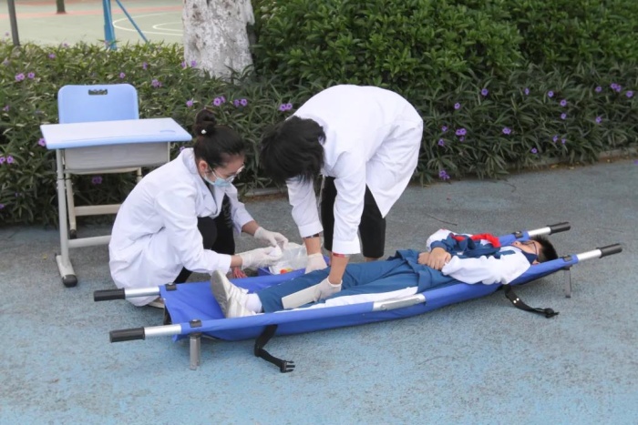 到達(dá)安全區(qū)域后,由各班班主任立刻清點(diǎn)人數(shù)層層上報(bào)。按照演練方案,行動(dòng)組發(fā)現(xiàn)一名學(xué)生“被困” 教室,指揮組組長孫慧濤副校長發(fā)出“請立即組織搜救”的指示,自救隊(duì)立即對“受傷被困”學(xué)生進(jìn)行救助。宿舍樓陽臺(tái)“冒煙著火”(煙霧彈模擬), 1 名生活老師晃動(dòng)毛巾“呼救”,行動(dòng)組組長孫慧濤副校長立即做出行動(dòng)指示,指定保安人員打開消防栓進(jìn)行滅火、拉好警戒線。同時(shí),報(bào) 119 請求支援。消防隊(duì)員迅速響應(yīng),駕駛消防車進(jìn)入校園開展救援。同時(shí),“受傷被困”學(xué)生也被成功搜救出來,到醫(yī)療救助點(diǎn)進(jìn)行包扎、檢查。