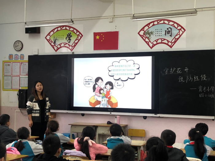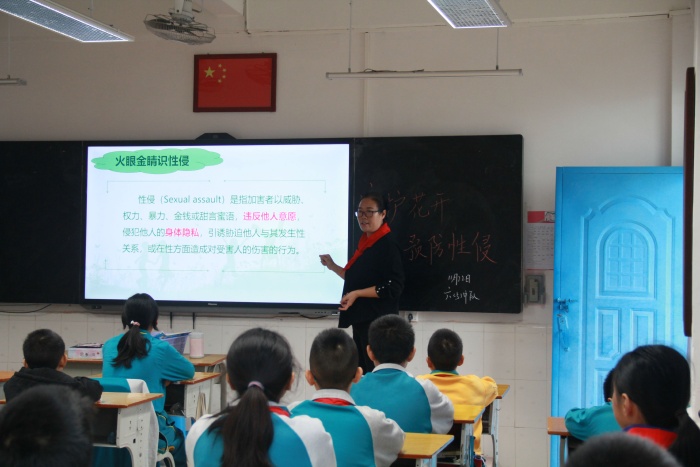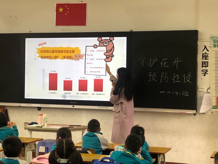 班會課上,老師借助多媒體輔助解說,與學(xué)生充分互動交流,從“教孩子們認識隱私部位”“教孩子們識別實施性侵害的伎倆”等,給學(xué)生上了一堂保護未成年人的性教育課程,讓學(xué)生建立了“隱私”的概念,學(xué)會如何保護自己和尊重別人的隱私部位等知識。接著,課堂引入小游戲“身體紅綠燈”教孩子們?nèi)绾伪鎰e壞人、保護自己,當面臨正在實施的性侵害如何處理、遭遇性侵害后如何尋求幫助等問題展開學(xué)習(xí),讓孩子們提高警惕,增強防范意識。