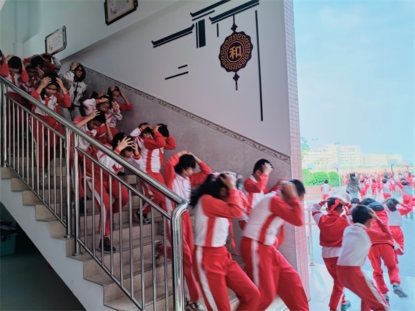 在第一次警報響起時,老師迅速組織學(xué)生躲在桌子底下以及“三角”區(qū)域等安全的位置緊急避險,同學(xué)們用書包、課本等物品保護(hù)頭部,躲在桌底。第二次警報響起時,各班老師立即組織學(xué)生沿著指定的疏散路線,快速有序地撤離教室,安全疏散到操場集合點(diǎn),整個過程秩序井然,快而不亂。