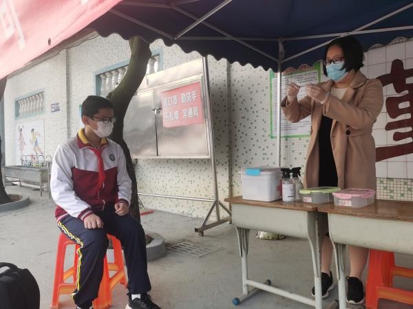 學校大門是校園疫情防控的第一道防線,把好校園第一道關(guān)卡至關(guān)重要。演練從模擬學生排隊等候進入校園開始,學生分兩個通道進入校門,經(jīng)用體溫測量儀檢測學生體溫后,體溫正常者有序進入校園。當發(fā)現(xiàn)學生體溫異常時,迅速用水銀溫度計進行復測,如果體溫依舊異常,送至隔離室,上報行政并進行信息登記并聯(lián)系衛(wèi)生部門作進一步處理。