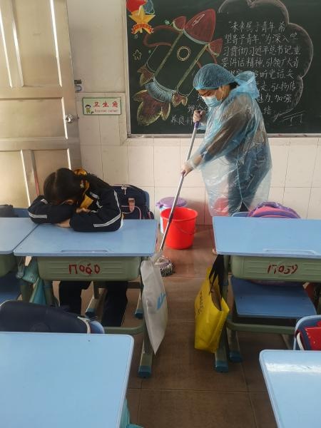 課室是學生主要的活動場所,演練第二階段,模擬任課教師上課期間,在教室里發(fā)現(xiàn)一學生萎靡不振,咳嗽,渾身發(fā)冷并伴有流感樣癥狀,馬上安排孩子與其他學生保持安全距離。將學生帶到校內(nèi)隔離點,并通知相關(guān)負責領(lǐng)導。同時,班主任重點對教室進行消殺。