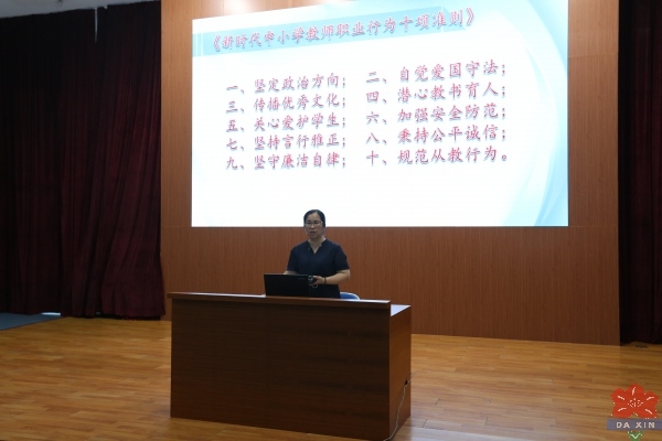 拜師活動(dòng)結(jié)束后,石岐中心小學(xué)梁麗文副校長(zhǎng)(主持全面工作)為大信學(xué)校全體老師做師德建設(shè)主題教育的專題講座。梁校長(zhǎng)用鏗鏘有力的聲音為大家傳遞并解讀《新時(shí)代中小學(xué)教師職業(yè)行為十項(xiàng)準(zhǔn)則》。強(qiáng)調(diào)作為教師我們應(yīng)該時(shí)刻自重、自省、自律、自警、自覺要求自己,執(zhí)著于教書育人,自覺維護(hù)人民教師的良好形象。教育全體老師不忘初心、牢記使命,堅(jiān)持中國(guó)特色社會(huì)主義辦學(xué)方向,堅(jiān)持育人為本、德育為先的教育理念,自覺做到以德立身、以德立學(xué)、以德施教、以德育德,為培養(yǎng)一代又一代擁護(hù)中國(guó)共產(chǎn)黨領(lǐng)導(dǎo)和我國(guó)社會(huì)主義制度、立志為中國(guó)特色社會(huì)主義事業(yè)奮斗終身的有用人才而不懈努力。