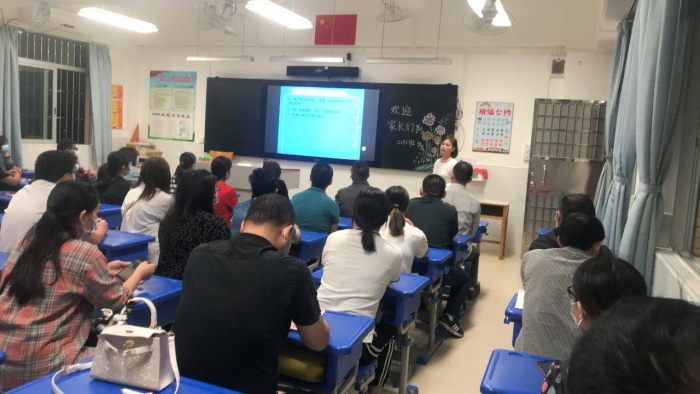 由于疫情原因,家長會在各班教室召開。雖然家長會正式開始的時間是7點,但很多家長六點半不到已經(jīng)迫不及待地進入教室,跟班主任進行交流溝通,了解孩子情況。