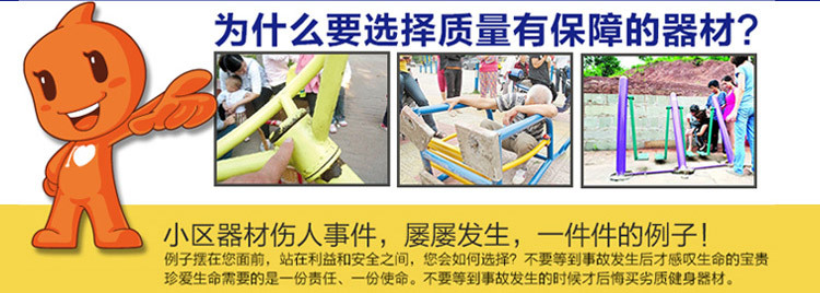 室外健身器材使用壽命 1**類是具有杠面彈力性能的器材。如單杠和雙杠;由于操作者健身運(yùn)動(dòng)時(shí)離地較高,具有一定的運(yùn)動(dòng)難度和危險(xiǎn)性,而且長(zhǎng)時(shí)間反復(fù)使用造成的彈性變形,容易使橫杠產(chǎn)生疲勞裂紋和斷裂,在參考競(jìng)技型單杠安全使用年限1年的基礎(chǔ)上,自2011年10月1日期實(shí)施室外健身器材新**標(biāo)準(zhǔn)所有器材的安全使用年限為8年。