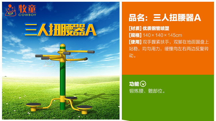 室外健身器材功能 室外健身器材從功能上來(lái)說(shuō)可分為:鍛煉人體腿、腰、臂部、肺活量、腹部、關(guān)節(jié)柔韌、強(qiáng)肝健脾、調(diào)整人體內(nèi)分泌、舒經(jīng)活絡(luò)、增強(qiáng)消化道、下焦、平衡能力、胸肌、臂力、增強(qiáng)心肺功能與協(xié)調(diào)能力等。