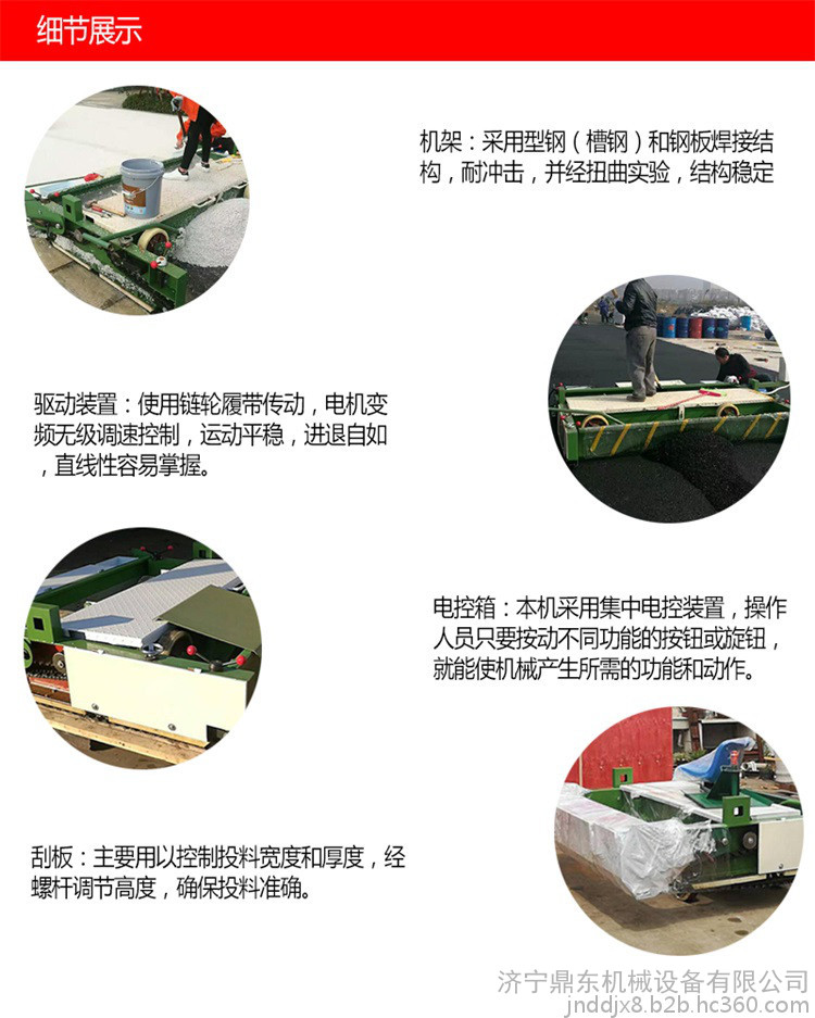 2、驅(qū)動裝置:使用鏈輪履帶傳動,電機變頻無 調(diào)速控制,運動平穩(wěn),進退自如,直線性容易掌握。如果需要弧形鋪設(shè),轉(zhuǎn)彎操作有很方便,不受弧形大小的限制。不同底部的基礎(chǔ)均可行走。