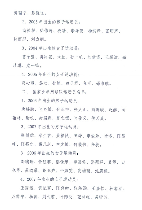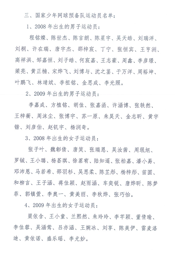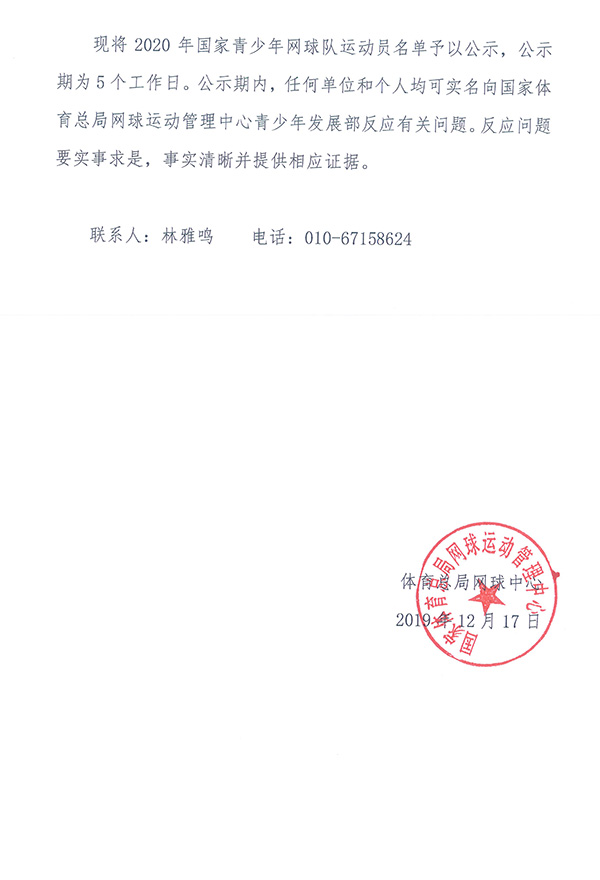 關于公示2020年度國家青少年網球隊運動員名單的函
