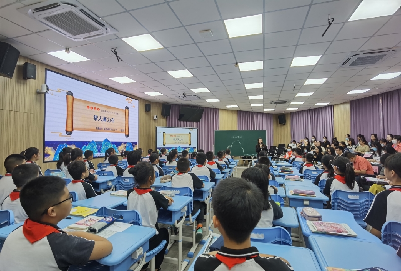 活動(dòng)的第一項(xiàng)議程,由龍江城區(qū)中心小學(xué)葉麗燕副校長帶來一節(jié)五年級的課例展示——《獵人海力布》。葉老師通過設(shè)定“民間故事大講堂”的主題情境,由此推出了“講好海力布的故事,爭當(dāng)民間故事傳承人”的核心任務(wù),聚焦“創(chuàng)造性復(fù)述”這一語文要素,進(jìn)階式安排了“故事內(nèi)容我回顧”“創(chuàng)造復(fù)述我挑戰(zhàn)”“人物形象我來悟”三個(gè)語言實(shí)踐活動(dòng),嵌入式進(jìn)行評價(jià),在課堂中體現(xiàn)“教學(xué)評一致性”的理念。