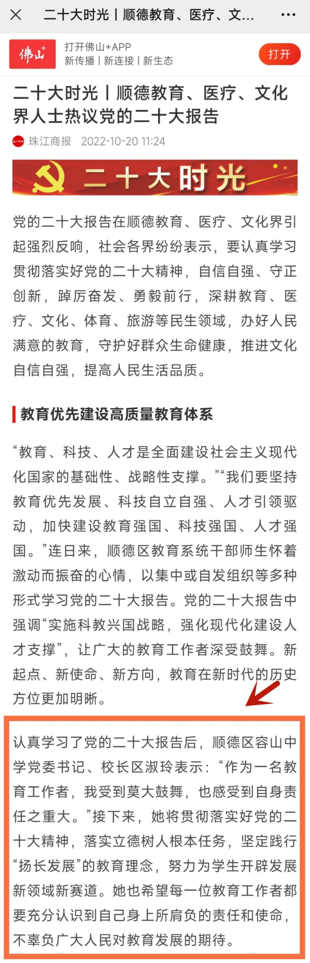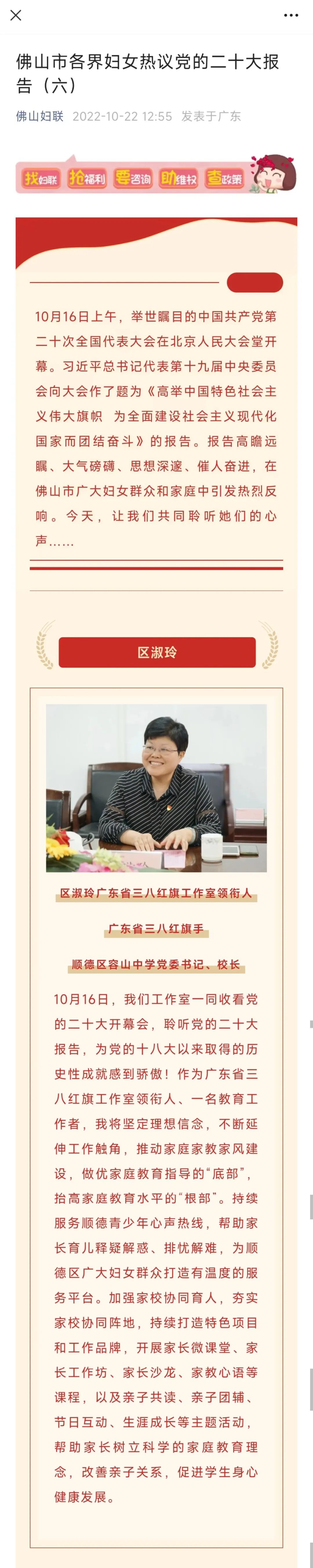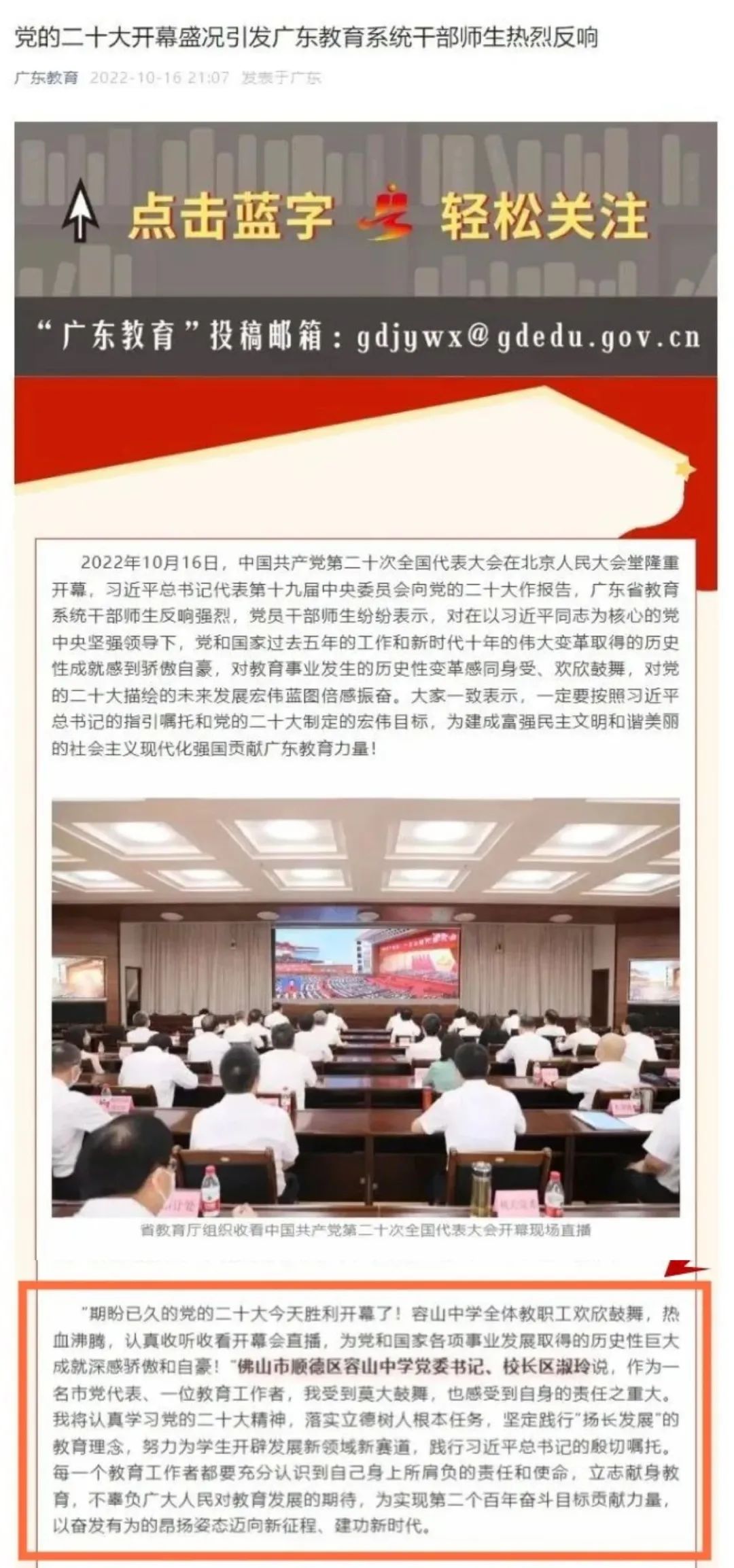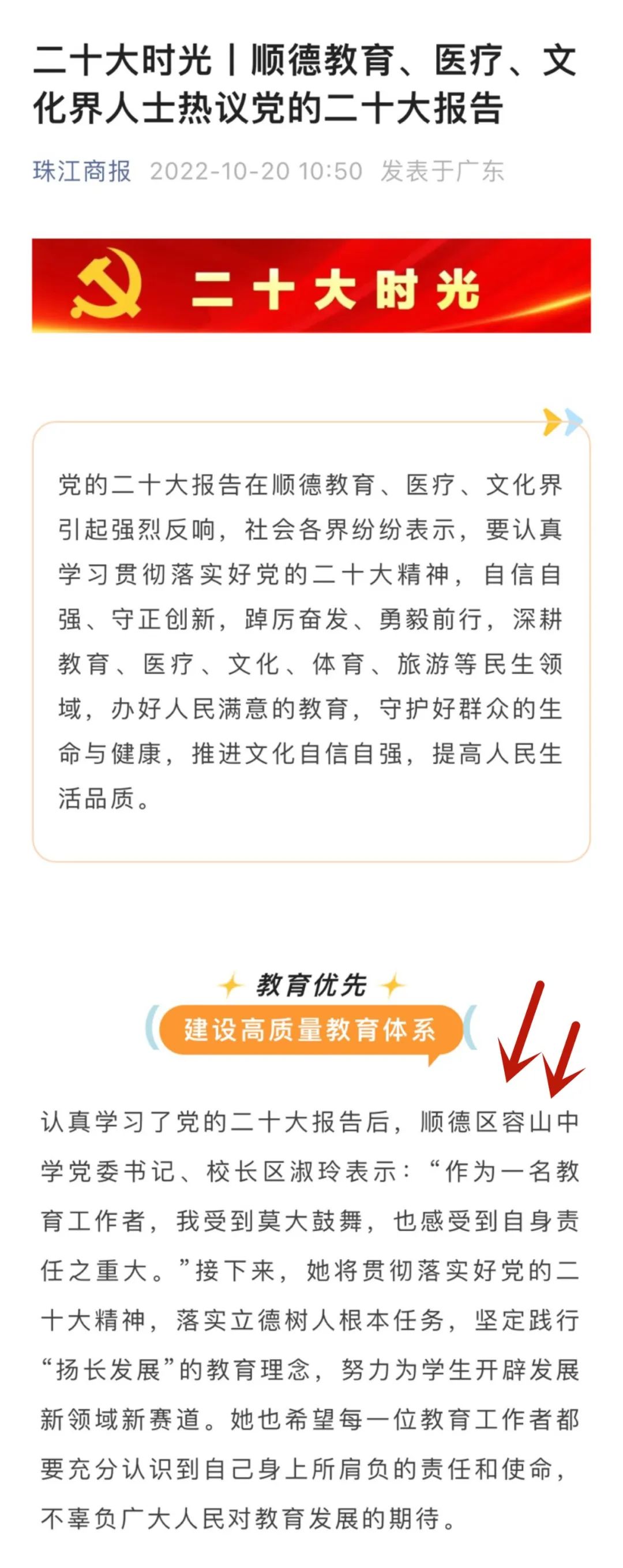 10月16日,中國(guó)共產(chǎn)黨第二十次全國(guó)代表大會(huì)在北京召開。當(dāng)天上午,容山中學(xué)黨委組織了全體教師收看本次大會(huì)的開幕會(huì),老師們反響熱烈,紛紛分享了自己的感想?!稄V東教育》公眾號(hào)平臺(tái)率先刊登了我校黨委書記、校長(zhǎng)區(qū)淑玲的心得,區(qū)淑玲校長(zhǎng)是被《廣東教育》公眾號(hào)刊登的唯一一位普通高中的校長(zhǎng)。隨后,還有多家知名媒體,如佛山+、珠江商報(bào)、佛山婦聯(lián)等大幅報(bào)道區(qū)淑玲校長(zhǎng)觀看中國(guó)共產(chǎn)黨第二十次全國(guó)代表大會(huì)開幕會(huì)心得。