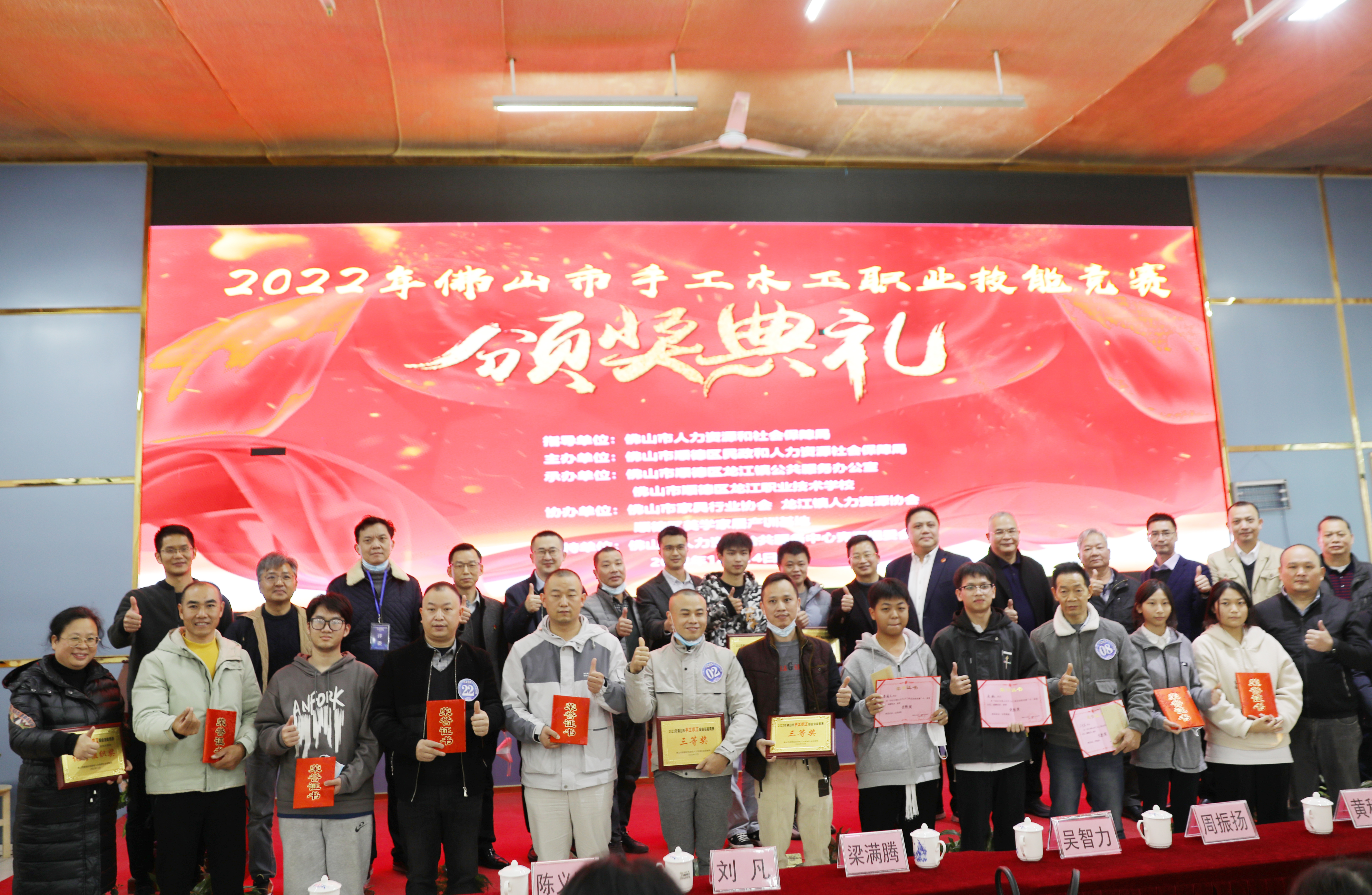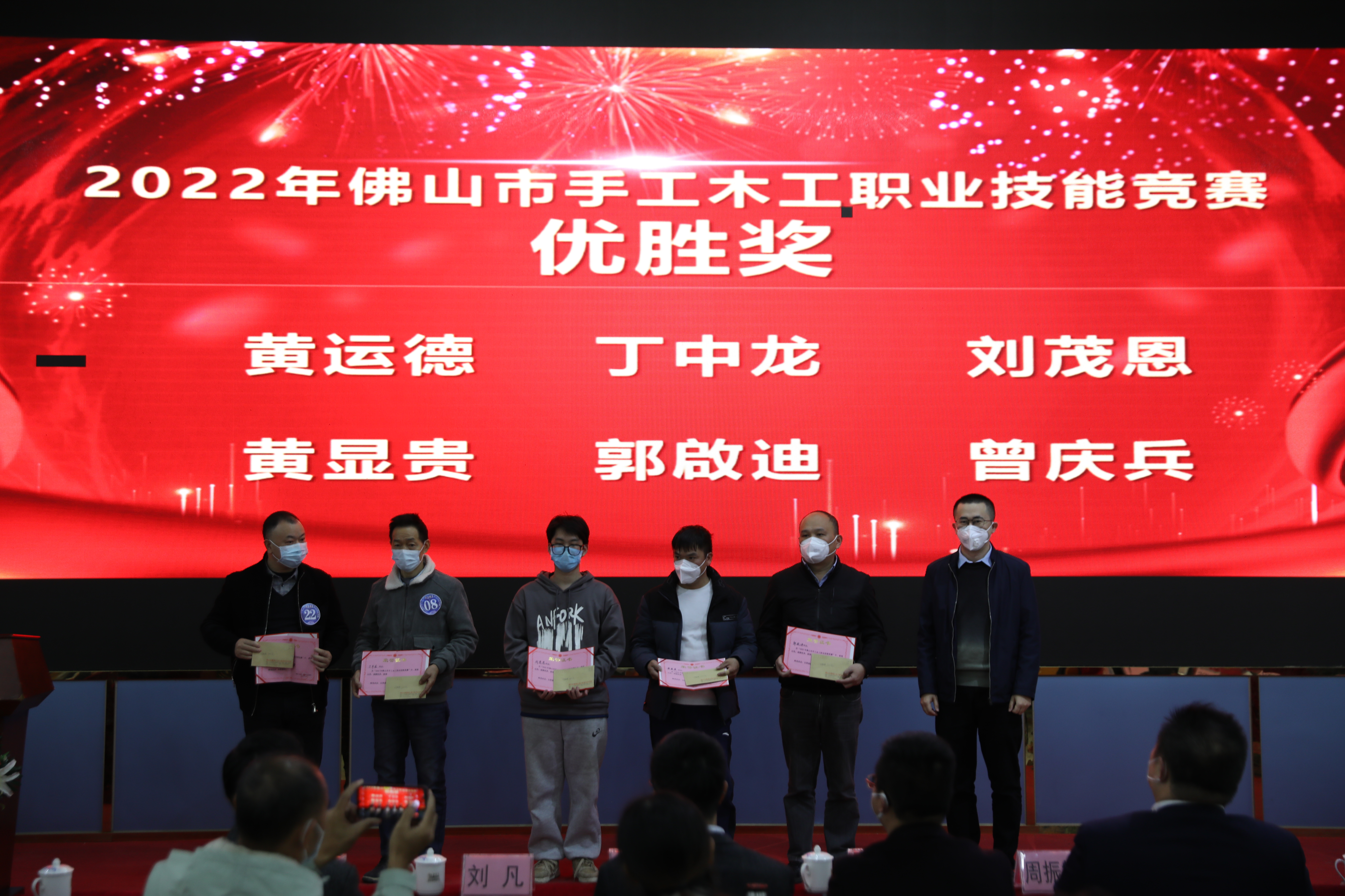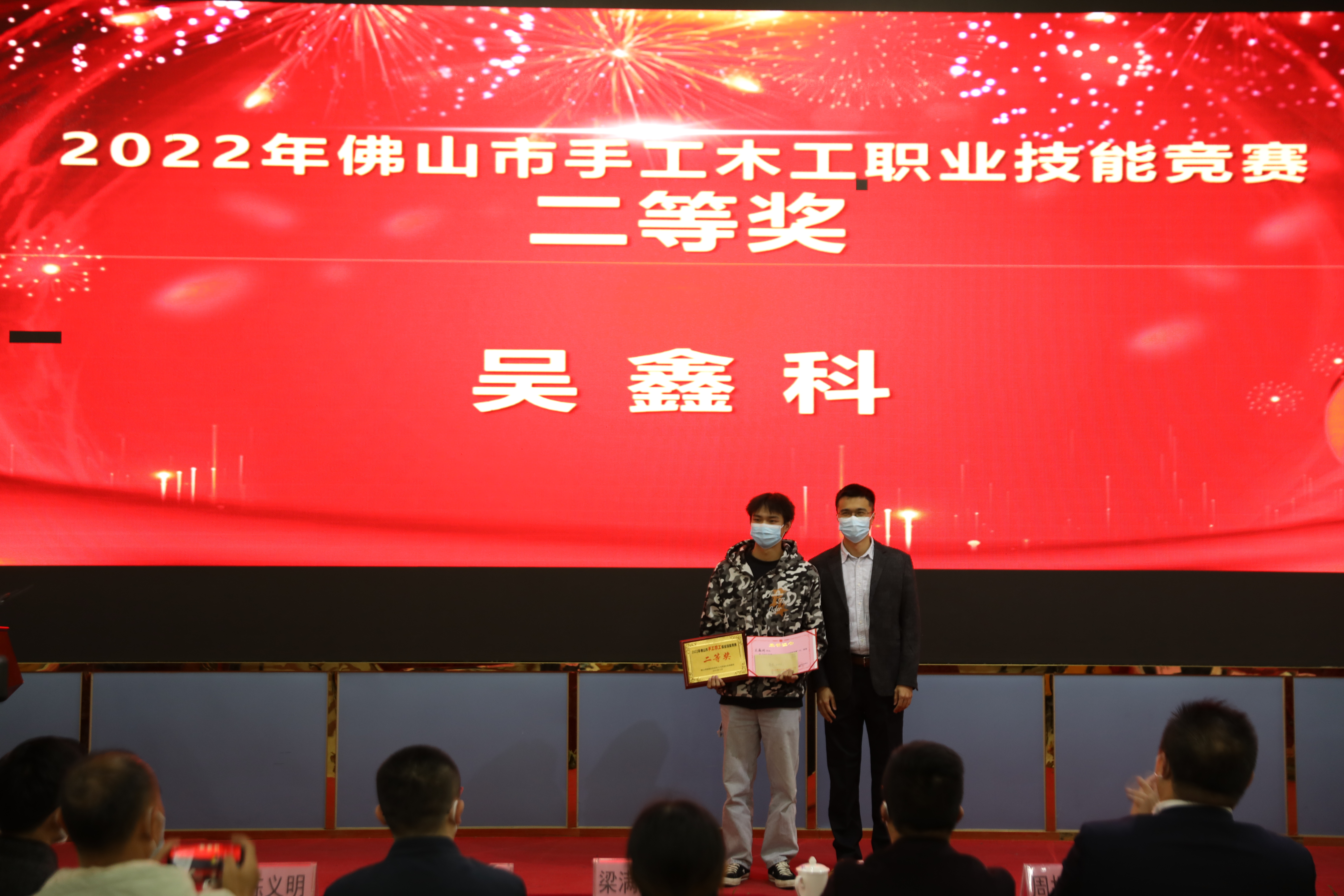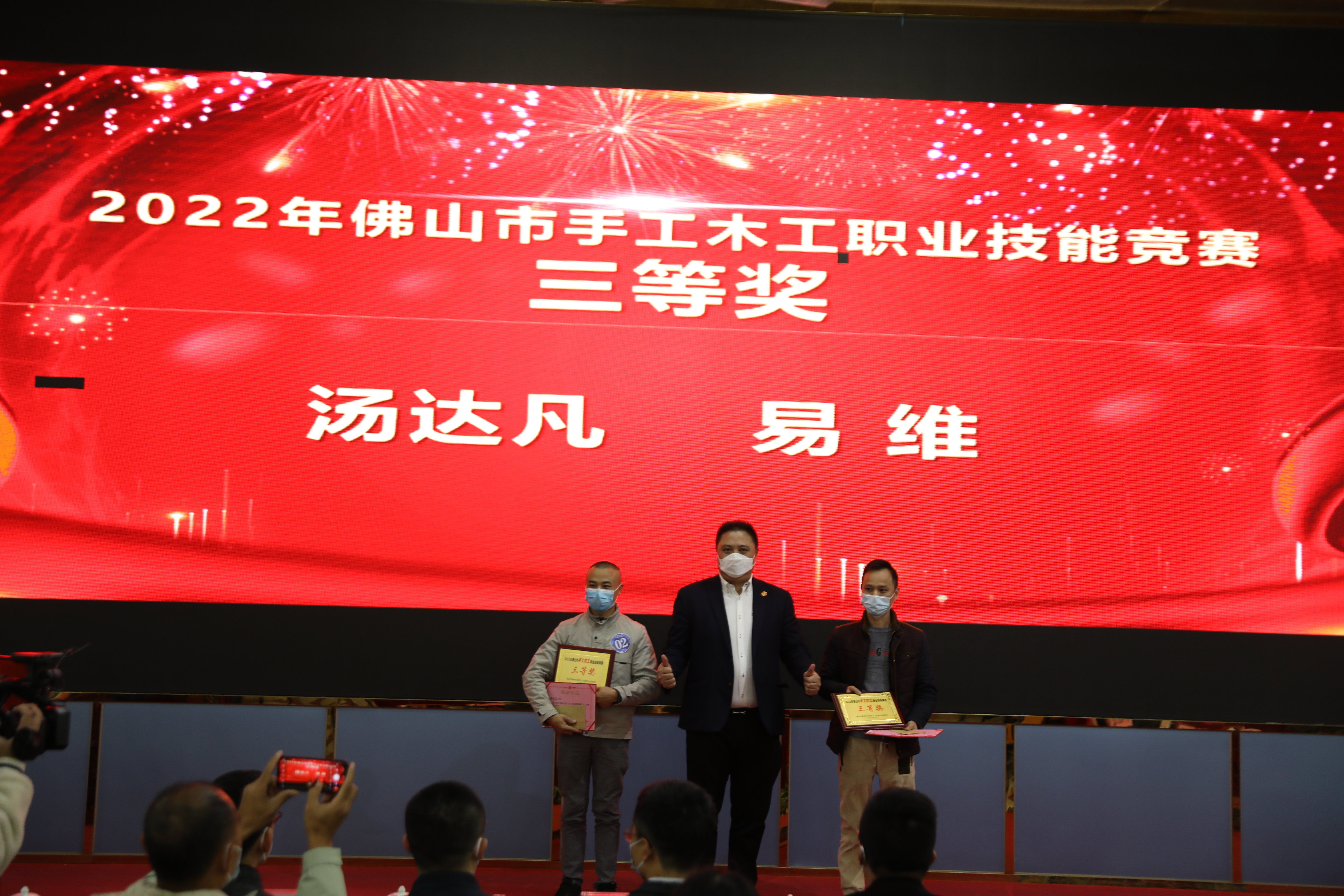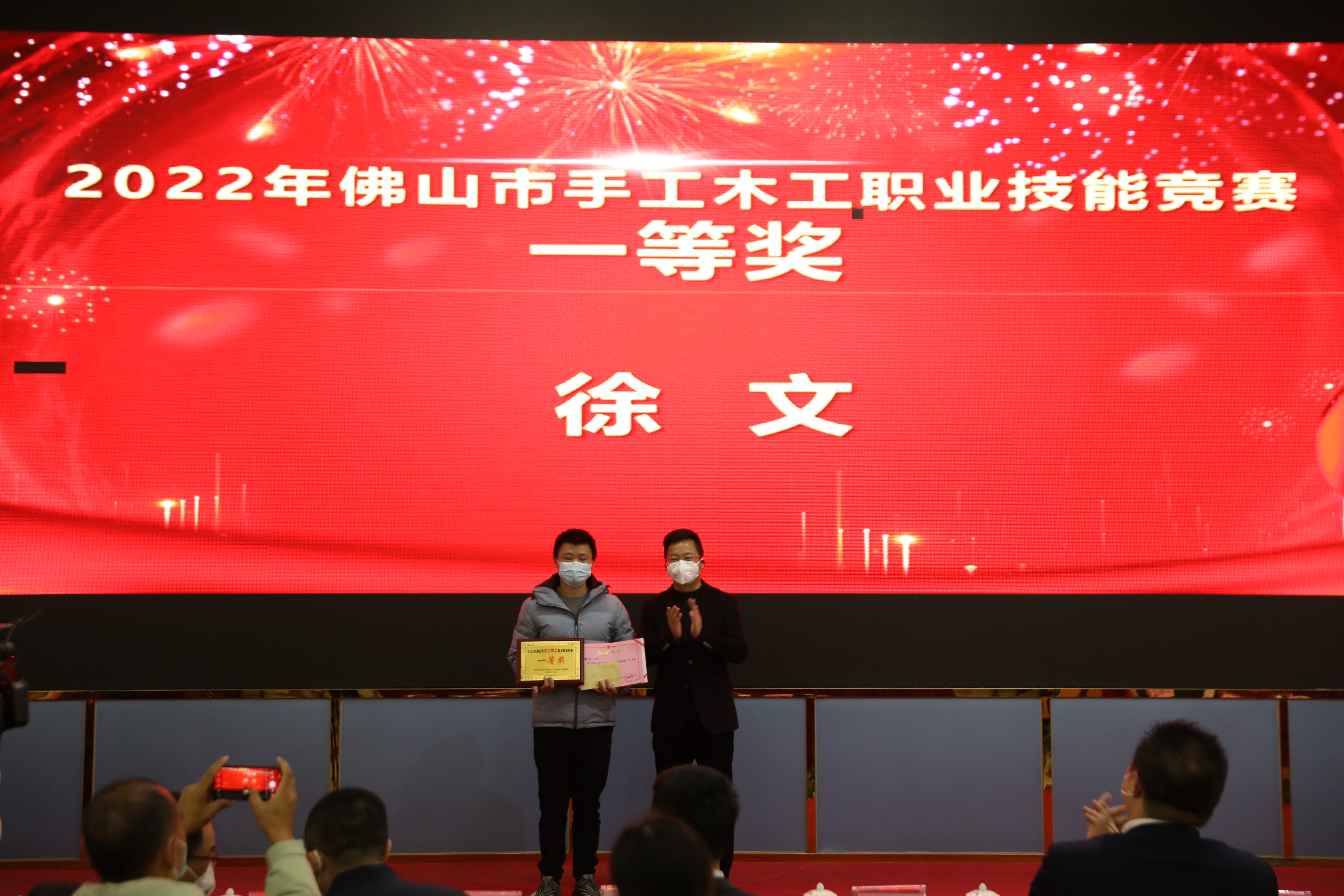 順德區(qū)民政和人力資源社會(huì)保障局就業(yè)促進(jìn)科科長(zhǎng)劉凡為木工大賽優(yōu)勝獎(jiǎng)獲獎(jiǎng)?wù)哳C獎(jiǎng)