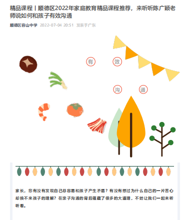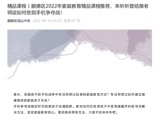 學(xué)校抓住市區(qū)開展精品課程及首屆佛山家庭教育家等評選活動,狠抓質(zhì)量,提高家庭教育精品課程意識,在多次打磨的基礎(chǔ)上推出系列精品課程,如曾潔薇《告別親子手機(jī)爭奪戰(zhàn)》、梁曉婷《家長如何協(xié)助孩子正確管理手機(jī)》、陳廣穎《如何與孩子有效溝通》等精品課程,獲得市區(qū)二三等獎獎項(xiàng)。
