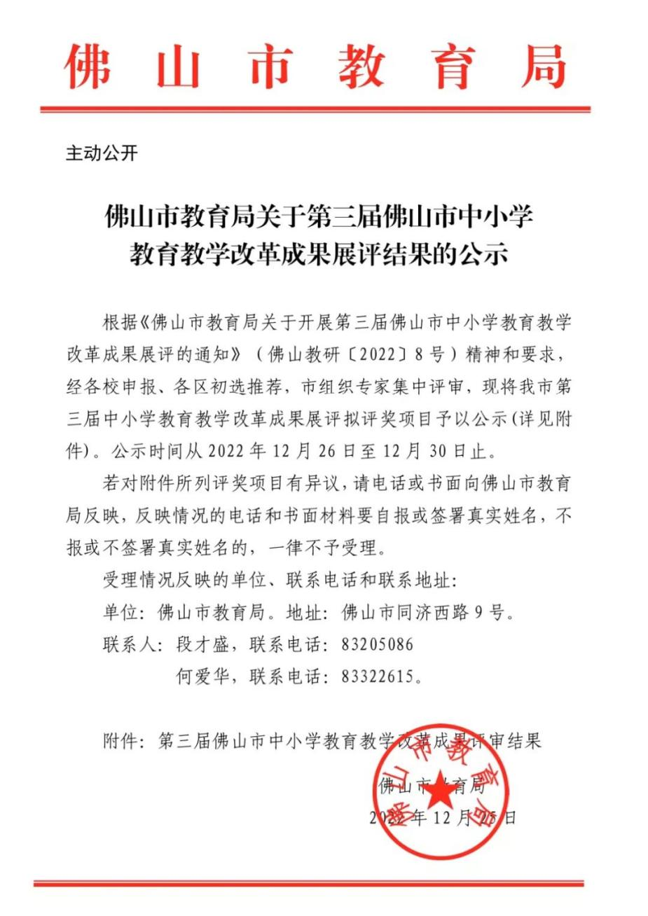 凝心聚力 碩果盈枝 時(shí)序更替,華章日新。歲月不居,天道酬勤?;厥撞黄椒驳?022年,奮進(jìn)的泰安人行健不息,在教育科研的路上一直努力攀登,昂首向前! 熱烈祝賀我校在第三屆佛山市中小學(xué)教育教學(xué)改革成果展評(píng)中,由陳燕校長(zhǎng)主持的課題成果《唱響音樂(lè)之聲 暢想美育筑夢(mèng) ——基于核心素養(yǎng)的中小學(xué)班級(jí)合唱教學(xué)研究與實(shí)踐》獲得一等獎(jiǎng)! 同時(shí),在第38屆佛山市青少年科技創(chuàng)新大賽暨泛家居創(chuàng)意大賽中,我校鐘庭鋒老師獲科技輔導(dǎo)員科技教育創(chuàng)新成果一等獎(jiǎng)! 在砥礪奮進(jìn)的日子里,夢(mèng)想已經(jīng)照進(jìn)現(xiàn)實(shí),科研助力教育教學(xué)實(shí)踐,教師的科研工作對(duì)于教學(xué)活動(dòng)的支撐是一個(gè)重要方面,在另一方面,也實(shí)現(xiàn)了教學(xué)活動(dòng)對(duì)于科研工作的促進(jìn),也就是在日常教育實(shí)踐之中提出教學(xué)重點(diǎn)難點(diǎn)及熱點(diǎn)問(wèn)題,并對(duì)這些問(wèn)題展開(kāi)深入的科學(xué)研究,為“科研支撐教學(xué)”提供更扎實(shí)、更充足的資源,并最終形成科研支撐教學(xué)、教學(xué)促進(jìn)科研的雙向互動(dòng)。 展望2023年,全體泰安人勠力同心、銳意進(jìn)取,與時(shí)代同向,與祖國(guó)同行!