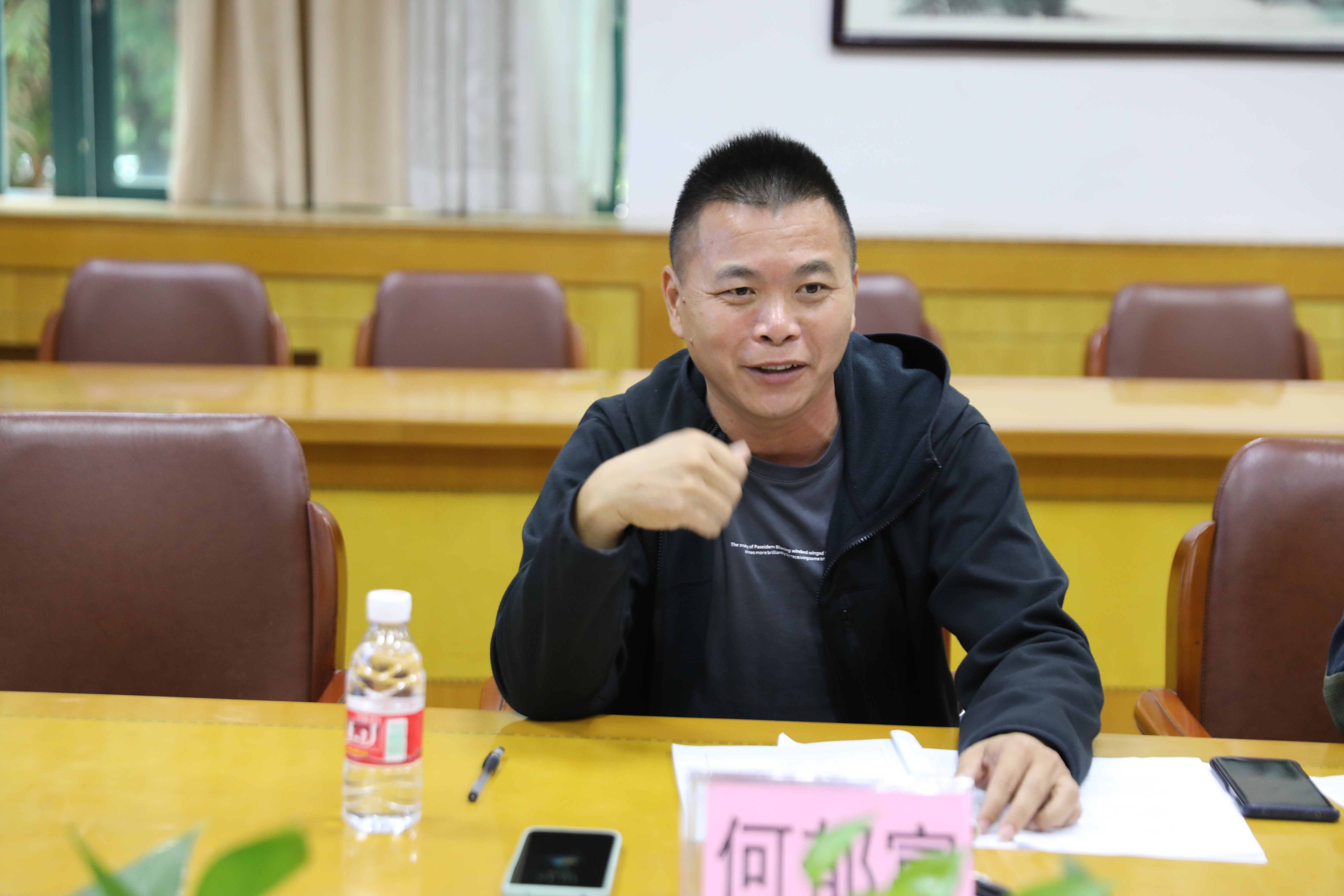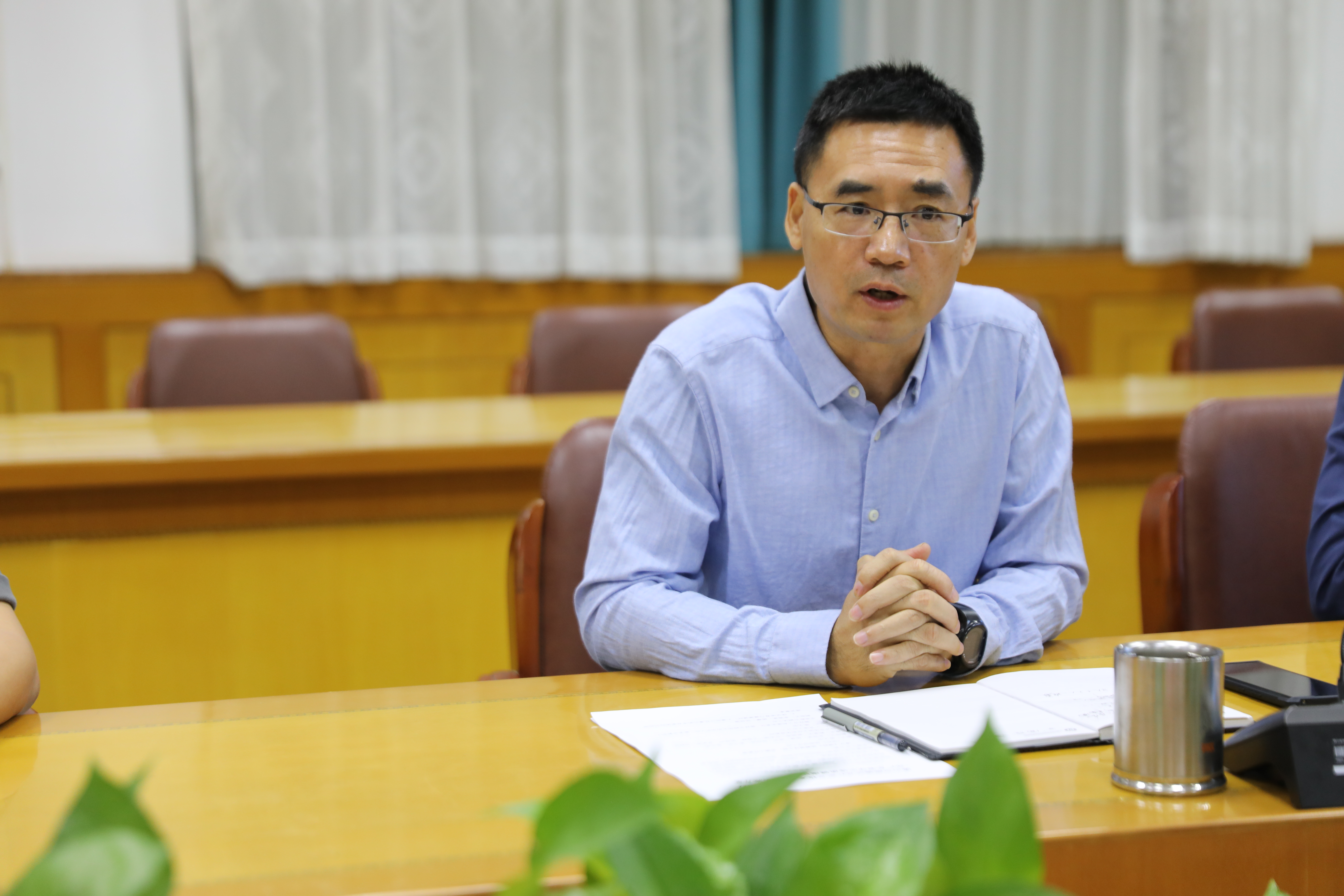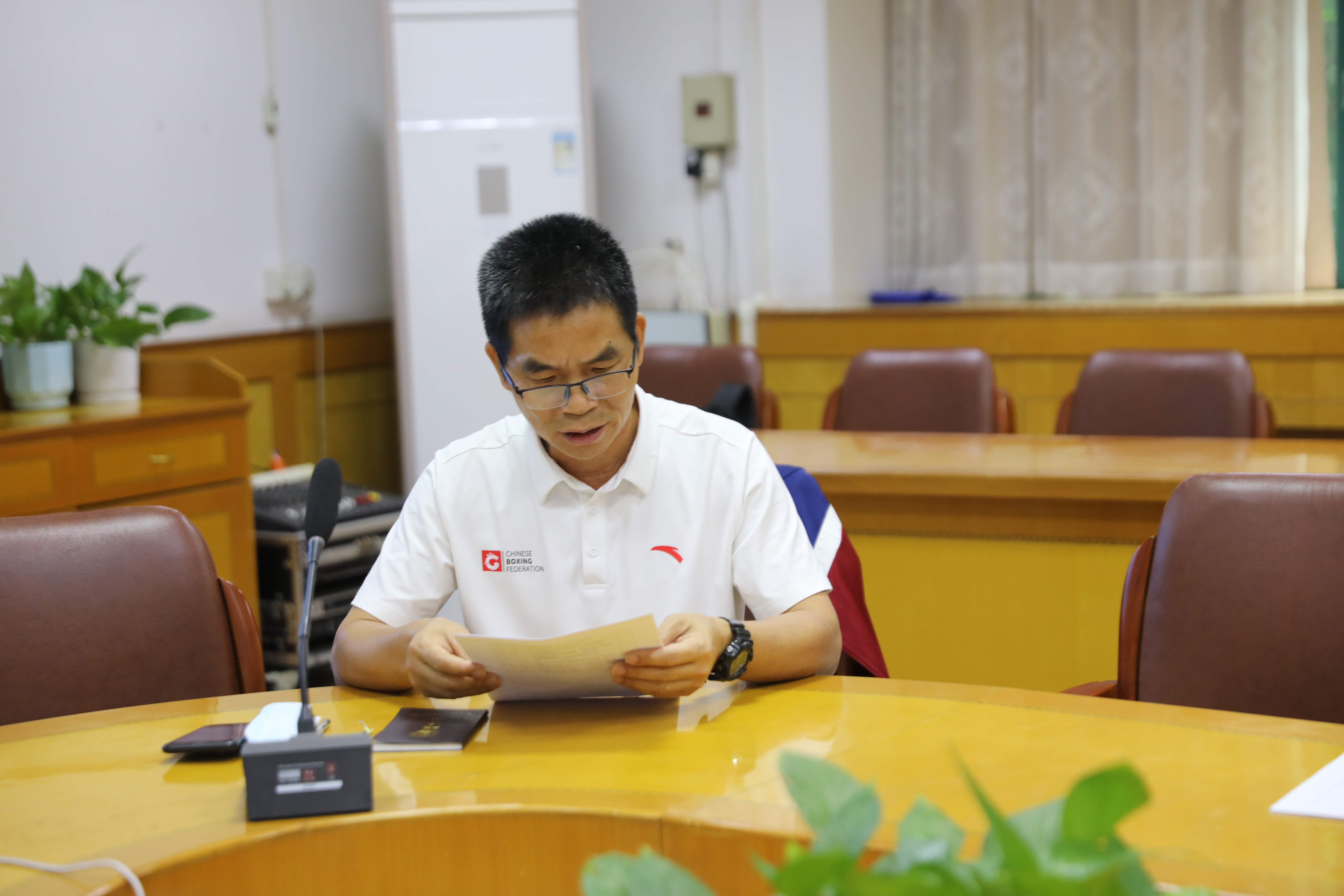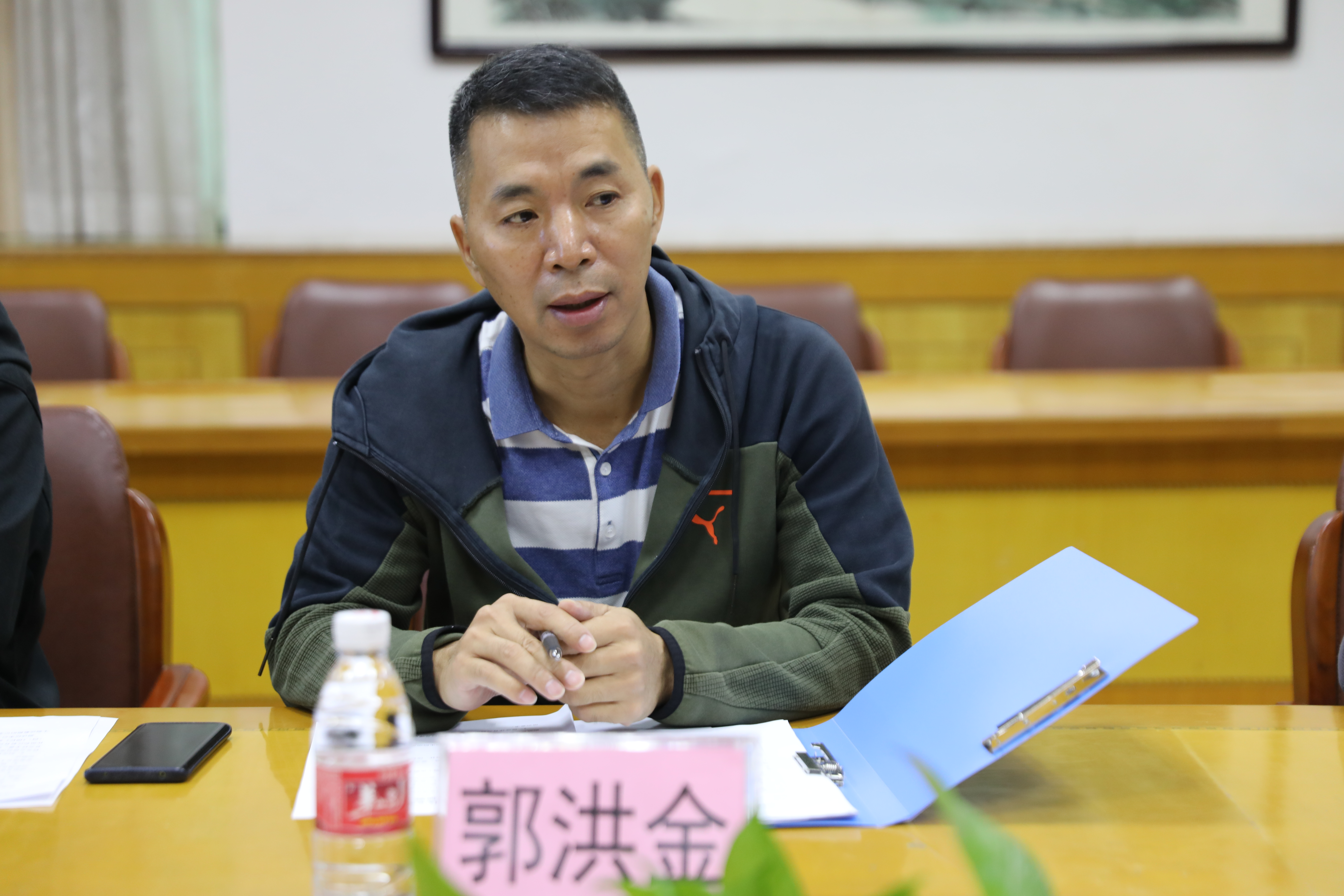 巡檢督導組郭洪金、何郁老師與副校長余錦棠、教務處主任邱旭波以及體育教研科組全體老師在會議室召開相關工作會議。