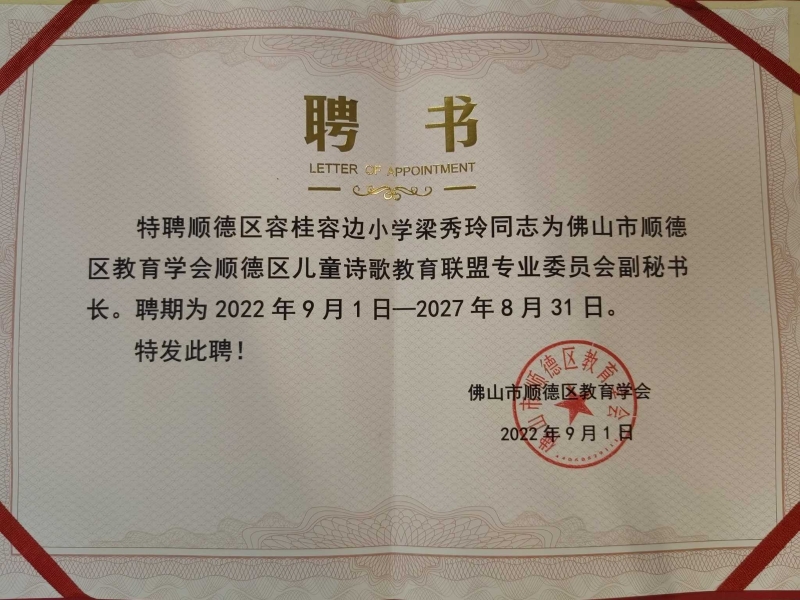 啟動(dòng)儀式后,順德區(qū)兒童詩(shī)歌教育聯(lián)盟召開(kāi)第一次理事會(huì)議。容邊小學(xué)作為第一批“順德區(qū)語(yǔ)言文字推廣基地”及2022-2027年的“順德區(qū)兒童詩(shī)歌教育聯(lián)盟成員學(xué)?!鲍@頒榮譽(yù)牌匾。此外,容邊小學(xué)彭海云校長(zhǎng)被聘為新一屆順德區(qū)教育學(xué)會(huì)兒童詩(shī)歌教育聯(lián)盟專(zhuān)業(yè)委員會(huì)理事,容邊小學(xué)梁秀玲老師被聘任為順德區(qū)教育學(xué)會(huì)順德區(qū)兒童詩(shī)歌教育聯(lián)盟專(zhuān)業(yè)委員會(huì)副秘書(shū)長(zhǎng)。