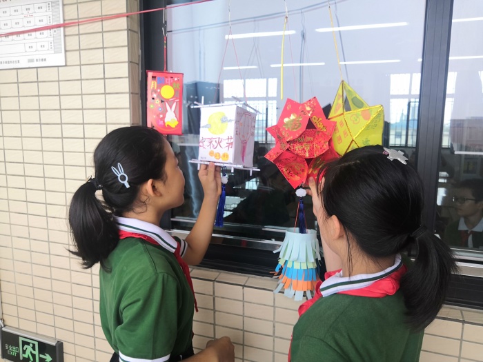 一大早,學(xué)生們滿心歡喜提著自己的燈籠進(jìn)校園,臉上掛著激動雀躍的笑容。首先各班班主任開展了以“我們的節(jié)日——中秋佳節(jié)”為主題的班會課。課上,老師既通過精心的課件、生動的視頻、有趣的故事,引領(lǐng)學(xué)生了解中秋有關(guān)的故事和習(xí)俗,感受傳統(tǒng)文化的魅力,也讓學(xué)生交流分享親子制作燈籠的創(chuàng)意與感受。倡導(dǎo)學(xué)生學(xué)習(xí)變廢為寶、學(xué)科融合、親子合作等優(yōu)良品質(zhì)。隨后師生一起興奮地提著燈籠拍照、布展。高高掛起的五彩燈籠裝飾了教室的走廊,成為一道靚麗的風(fēng)景線,引來了師生駐足觀賞,品鑒自己最喜歡的作品,并根據(jù)創(chuàng)意、色彩、構(gòu)造為最佳設(shè)計(jì)的作品投下神圣的一票。