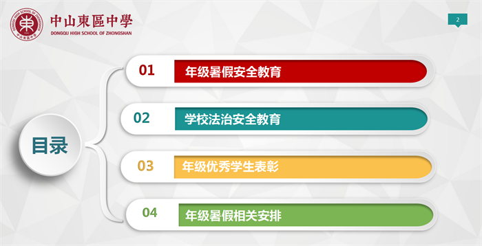 會(huì)議分成四個(gè)部分,首先,年級(jí)進(jìn)行暑假安全教育工作,戰(zhàn)“疫”尚未結(jié)束,疫情防控仍不能大意,不去人群密集的地方,出門做好防護(hù);交通安全,遵守交通規(guī)則,文明出行;防溺水安全,不獨(dú)自或約同學(xué)到池塘、河流、水庫(kù)、湖泊等地方游玩,牢記防溺水“六不準(zhǔn)”;手機(jī)已經(jīng)成為學(xué)生手邊必備的通訊工具,黃主任提醒學(xué)生要注意網(wǎng)絡(luò)安全。第二部分,對(duì)家長(zhǎng)及學(xué)生進(jìn)行法治教育工作,讓學(xué)生意識(shí)到做一名遵紀(jì)守法的公民的重要性。希望學(xué)生在日后遇到法律問(wèn)題時(shí),也能通過(guò)法律手段維護(hù)自身的合法權(quán)益。第三部分,針對(duì)本學(xué)期表現(xiàn)優(yōu)秀的學(xué)生進(jìn)行表彰,黃主任對(duì)獲獎(jiǎng)同學(xué)提出表?yè)P(yáng),并且號(hào)召其他同學(xué)向優(yōu)秀的同學(xué)學(xué)習(xí)。第四部分,對(duì)于暑假的相關(guān)工作進(jìn)行布置,希望同學(xué)們度過(guò)一個(gè)充實(shí)而有意義的假期生活。