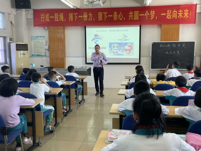 根據(jù)關(guān)于舉辦“百名書記開(kāi)講思政第一課”的文件精神,3月8日下午,中山市阜沙鎮(zhèn)豐聯(lián)小學(xué)在學(xué)校階梯教室舉行主題為“品北京冬奧盛宴,響習(xí)近平總書記號(hào)召,我們一起向未來(lái)——增強(qiáng)文化自信提速中華民族偉大復(fù)興”的思政第一課,學(xué)校黨支部詹前秒書記為四年級(jí)全體學(xué)生上了精彩的一課。