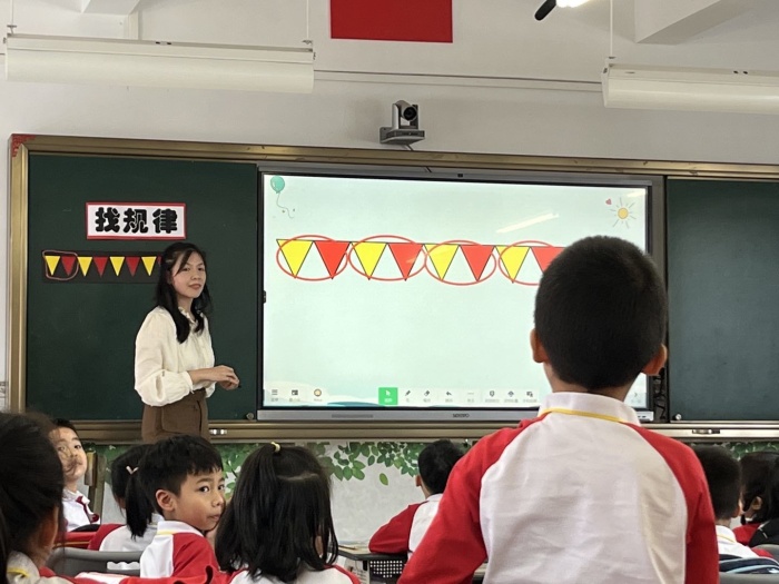 活動(dòng)伊始,大豐小學(xué)青年教師吳雁琪老師首先為大家呈上了一節(jié)一年級(jí)《找規(guī)律》的精彩課例。吳老師整節(jié)課的設(shè)計(jì),基于探究單的前置性學(xué)習(xí),通過(guò)生生互動(dòng),以達(dá)讓學(xué)生在數(shù)學(xué)課堂上“像數(shù)學(xué)家一樣探究”的學(xué)習(xí)效果。吳老師先是利用前置探究單學(xué)習(xí),激發(fā)學(xué)生探究的欲望。再通過(guò)說(shuō)一說(shuō)、找一找、擺一擺、畫(huà)一畫(huà)和圈一圈等體驗(yàn)活動(dòng),讓學(xué)生積累活動(dòng)經(jīng)驗(yàn)的同時(shí),力求體現(xiàn)新課程標(biāo)準(zhǔn)精神。這節(jié)課吳老師設(shè)計(jì)了貼近生活且富有趣味性的活動(dòng),讓學(xué)生在趣味中欣賞、觀察、猜想、驗(yàn)證,在美的感受中學(xué)習(xí)有趣的數(shù)學(xué),給予學(xué)生從直觀到抽象、從具體到概括地逐步發(fā)展的空間。