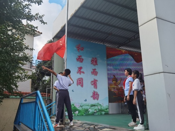 早上八點,全校師生整齊有序地集中操場進行莊嚴的升旗禮。升旗儀式在主持人孔梓穎堅定有力的聲音中拉開了序幕。旗手們踏著整齊的步伐,精神抖擻地走向升旗臺,在莊嚴的國歌聲中,鮮艷的五星紅旗冉冉上升。