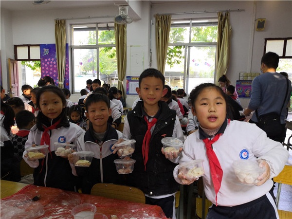 在搓湯圓活動中,師生們鋪好桌子,分好材料,挽起袖子,戴上手套,同學們的臉上洋溢著躍躍欲試的興奮。紛紛學著老師的動作,先在手上抹點面粉,然后再掐一塊糯米粉團,把它壓成一片,再在中間用手指弄一個窩窩,里面放上調(diào)好的餡料,外面再用糯米粉揉成一個“小球”,一個胖乎乎、圓滾滾的湯圓就做好了?!拔页晒?!”孩子們紛紛拿出自己的包好的湯圓向老師和同伴炫耀著,紅彤彤的臉上洋溢著比湯圓還甜的笑容。