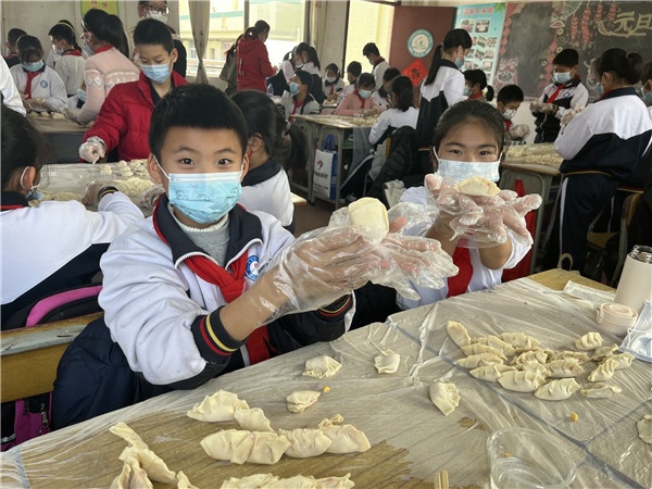 在“包餃子”活動上,同學們用手指靈活地捏動,在餃子皮上捏出排列有序的花紋,整整齊齊地擺在托盤里。不太會包餃子的同學,笨拙地擺弄著餃子皮,但也頻頻走下位置向別的同學虛心求教。孩子們拿著自己親手制作出的餃子,內(nèi)心里充滿了收獲的歡喜,校園里歡聲笑語不斷。