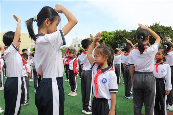 懷著成為少先隊(duì)員的滿(mǎn)滿(mǎn)自豪,新老隊(duì)員高唱《中國(guó)少年先鋒隊(duì)隊(duì)歌》,堅(jiān)定有力的歌聲在校園上空回蕩,為隊(duì)員們嶄新而多彩的少先隊(duì)生活吹響了新的號(hào)角。榮譽(yù)交接,使命傳承,六年級(jí)的少先隊(duì)員們?yōu)樾玛?duì)員佩戴紅領(lǐng)巾,紅領(lǐng)巾在陽(yáng)光里鮮艷奪目,新隊(duì)員們?cè)陉?duì)旗下神采奕奕。學(xué)校黨支部書(shū)記、少工委主任林宗技致辭,對(duì)新隊(duì)員表示祝賀同時(shí)勉勵(lì)少先隊(duì)員要牢記習(xí)近平總書(shū)記的囑托,從小培育共產(chǎn)主義理想,做社會(huì)主義事業(yè)的接班人。